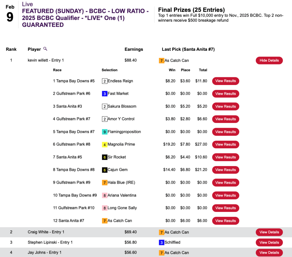 He also led the way in the day’s qualifier to the $350,000 Gtd. Players Championship here on April 5-6. Joining Machiz in Leg 2 of the 2025 HorseTourneys Champions Series will be the second- and third-place finishers Brandon Leigh (6 wins, 4 places) and 2024 Flo-Cal Faceoff champion Michael Solakis (6W, 3P). Like Machiz, Solakis backed Magnolia Prime. The best return for Leigh—who has been white hot of late—came via a max $22.00 place payoff.