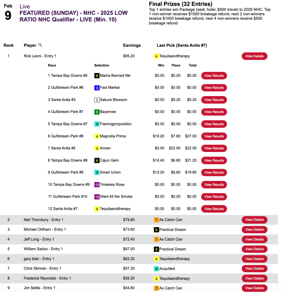 Leoni got himself a place in the big dance by prevailing in Sunday’s NHC Low Ratio qualifier at HorsePlayers.