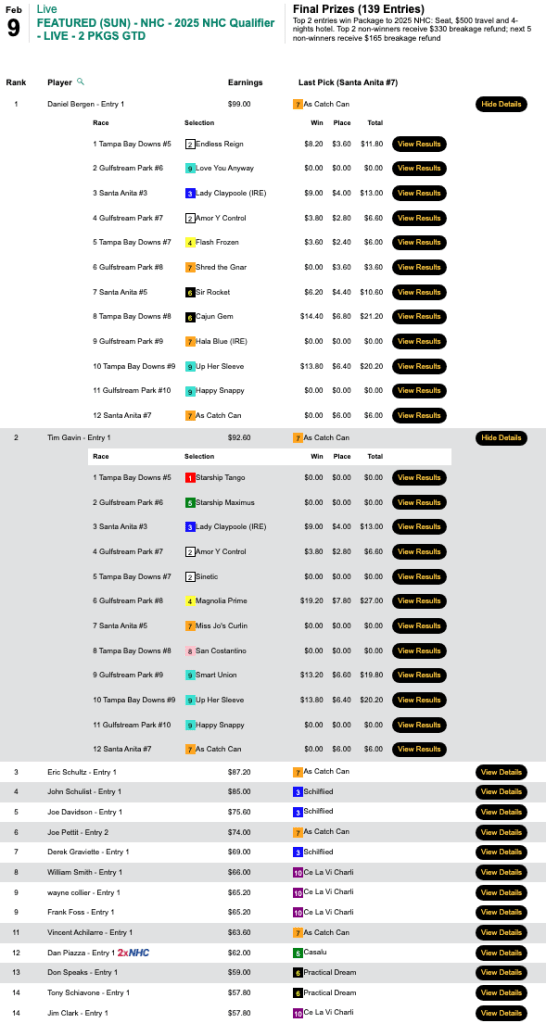 It was a busy Saturday at HorsePlayers with three featured tourneys. The one we haven’t gotten to yet was an open, $210 NHC qualifier.