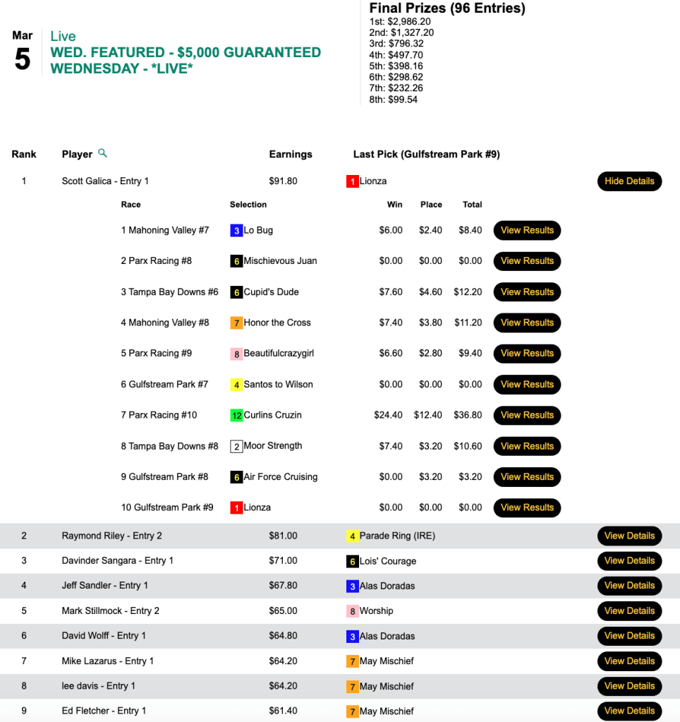 Curlins Cruzin ($24.80, $12.40) in the 10th at Parx was among 5 wins and 2 places put up by Galica en route to a victory worth $2,986 in Wednesday’s $5,000 Guaranteed cash game, which closed with a final purse of $6,636.