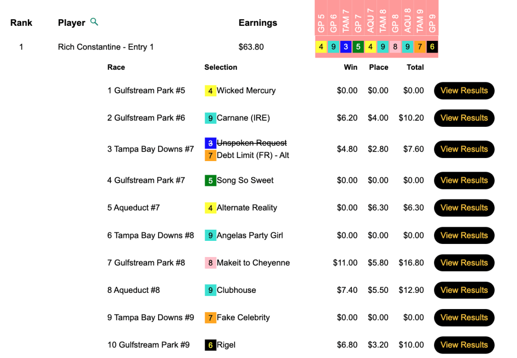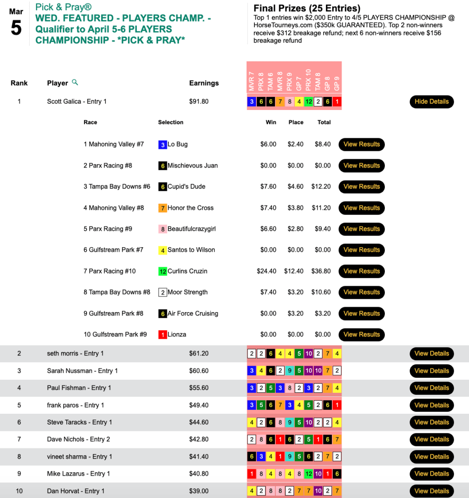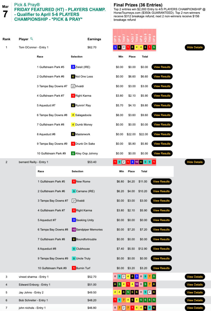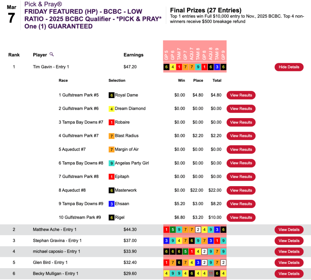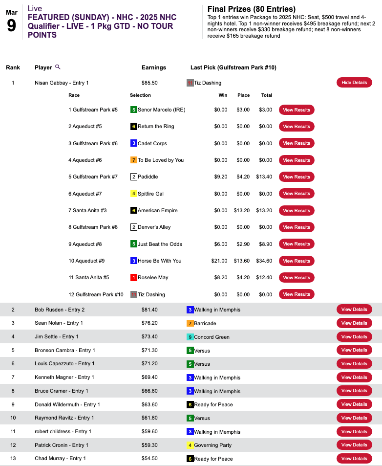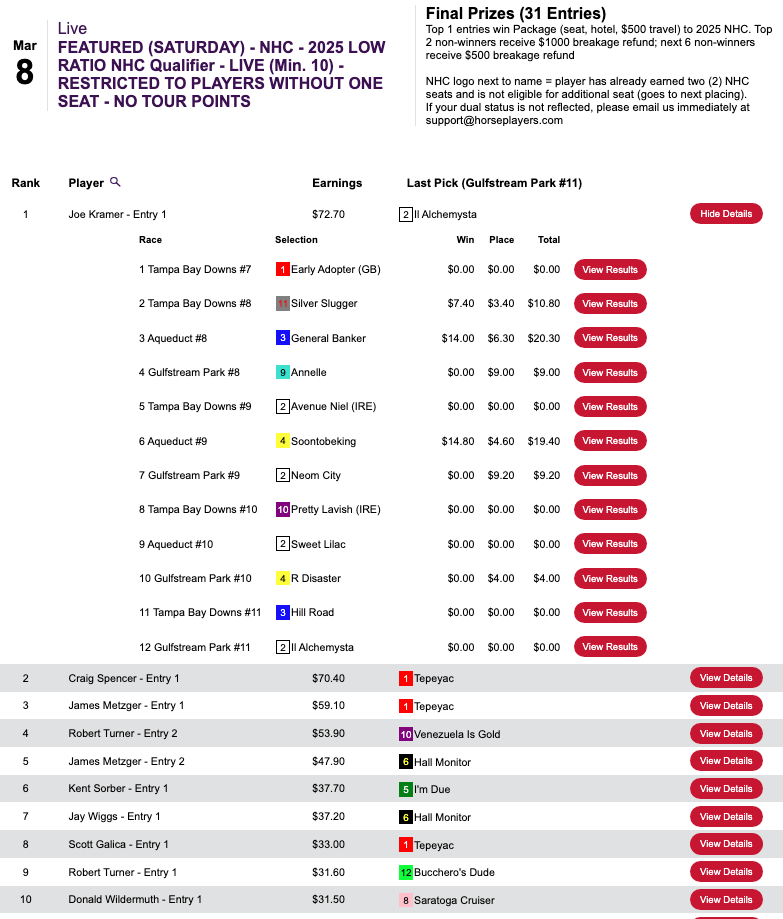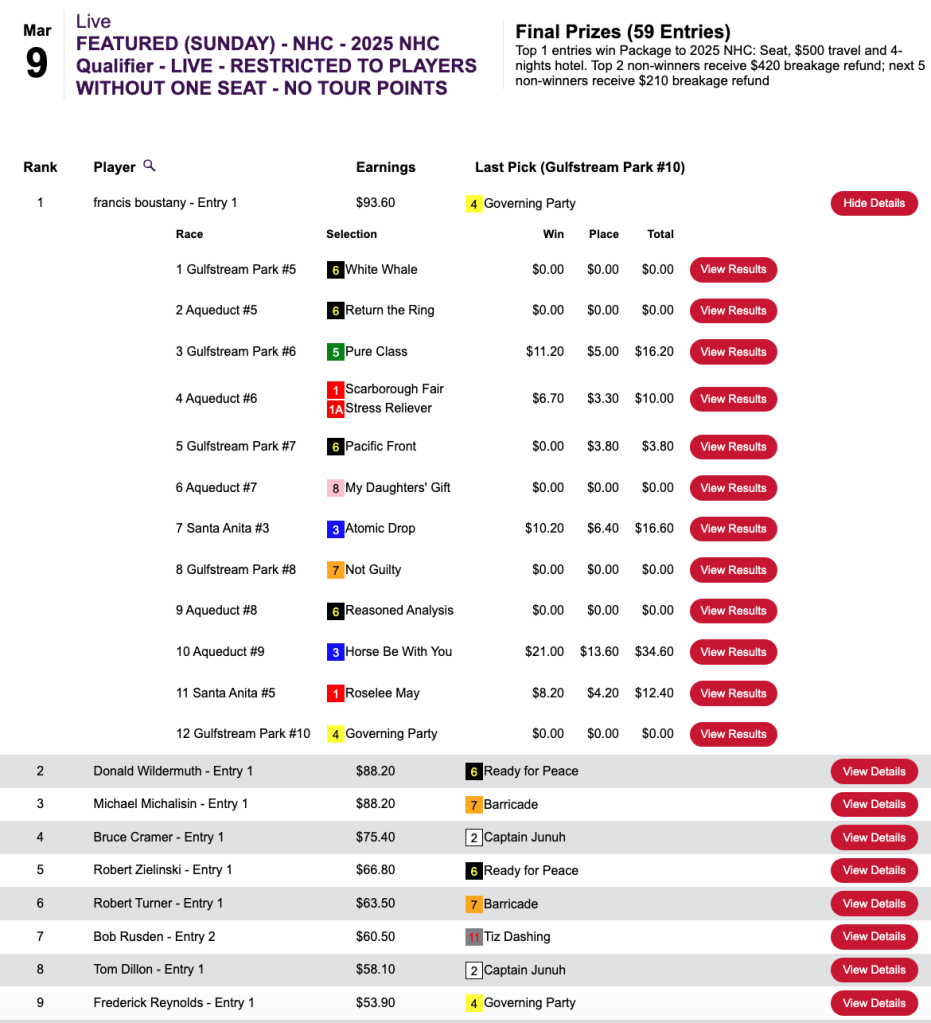 On April 5-6, Nichols will be competing for a purse of at least $350,000 right here at HorseTourneys in the Players Championship. That’s a result of Nichols racking up 5 winners—including Royal Event ($49.80, $15.60) in the 10th at Aqueduct—plus 1 runner up in Saturday’s qualifier to the second leg of the 2025 HorseTourneys Champions Series. Nichols got a seat as did second-place finisher—and fellow Royal Event supporter—Phil Hoedebeck (3 wins, 2 places).