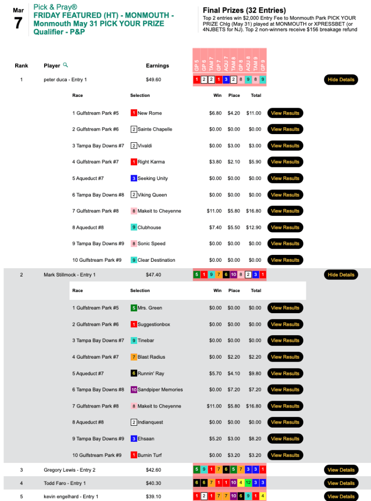Peter Duca (4 wins, 1 place) and last year’s Pick & Pray Classic champ Mark Stillmock (3W, 3P) garnered the $2,000 entries in Friday’s qualifier to the Monmouth Pick Your Prize Challenge.