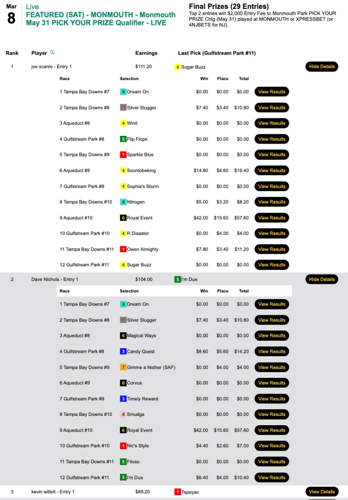 The same picks also brought Nichols a second $2,000 seat—this one to the May 31 Monmouth Pick Your Prize Challenge.