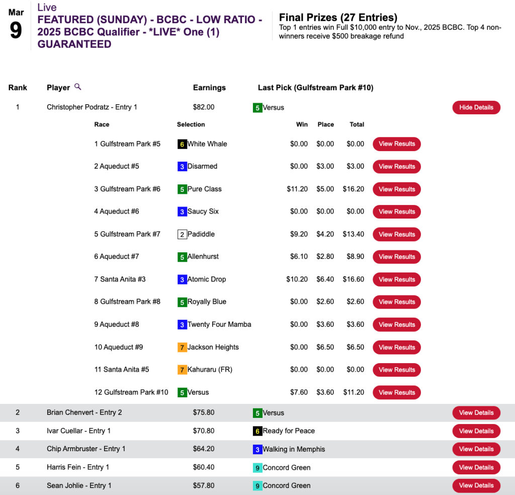 The other Sunday feature at HorsePlayers was a Low Ratio Breeders’ Cup Betting Challenge qualifier that was taken by Chris Podratz.