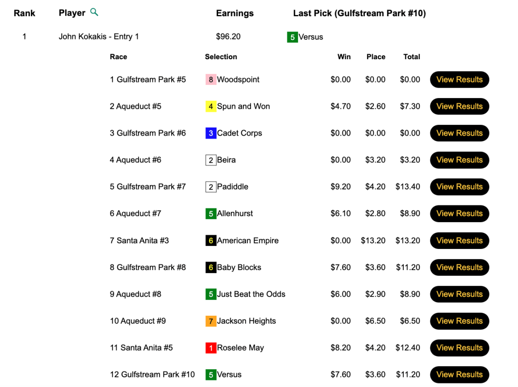 Happily for Kokakis, seven of his 10 productive horses were winners—led by Padiddle ($9.20, $4.20) in the 7th at Gulfstream. That’s how Kokakis was able to bank $12,501 in Sunday’s HT Tour battle, our $20,000 Guaranteed tourney, which was ultimately worth a total of $27,781.