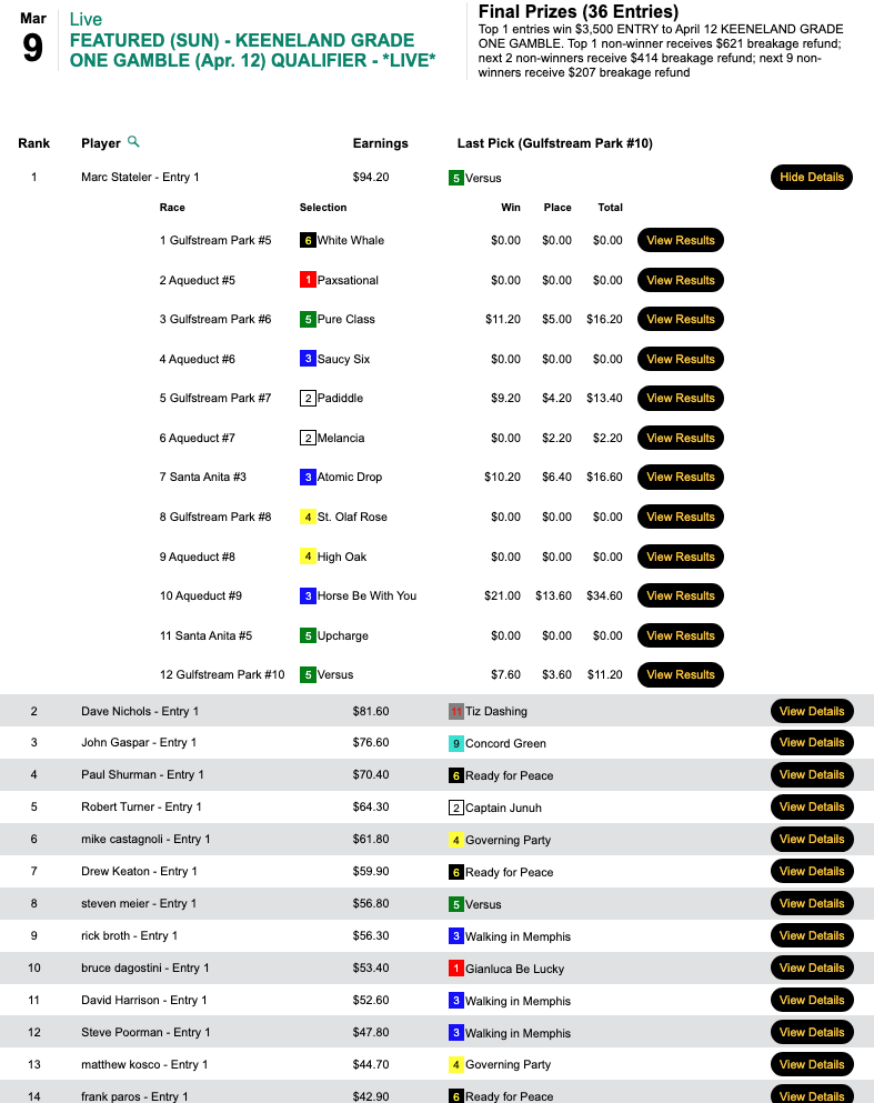Stephen Spinelli started fast with 4 straight winners, and he finished the day with 6 wins and 2 places. His best return came courtesy of Atomic Drop ($10.20, $6.40) in the 3rd at Santa Anita. Runner up Donald Wildermuth (4W, 2P) also got a late Vegas seat. He was one of the many Horse Be With You disciples who had a pleasant Sunday.