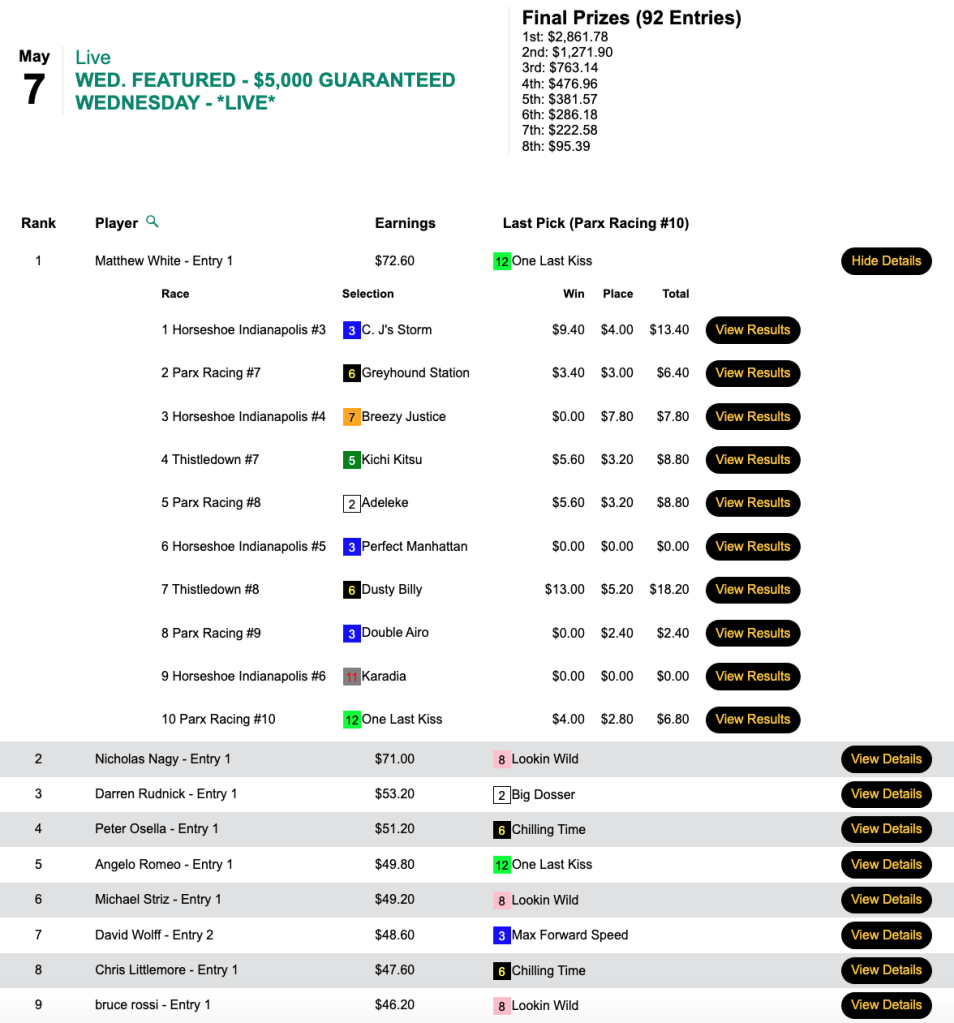 White put up 6 firsts and 2 seconds en route to taking Wednesday’s $5,000 Guaranteed tourney, which paid out a total of $6,359. It was a chalky day, but White found his way to the biggest price out there—Dusty Billy ($13.00, $5.20) in the 8th at Thistledown—and he garnered the $2,861 grand prize.