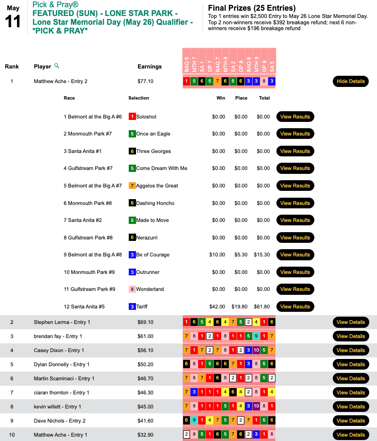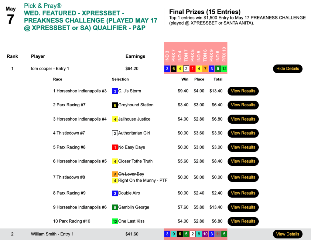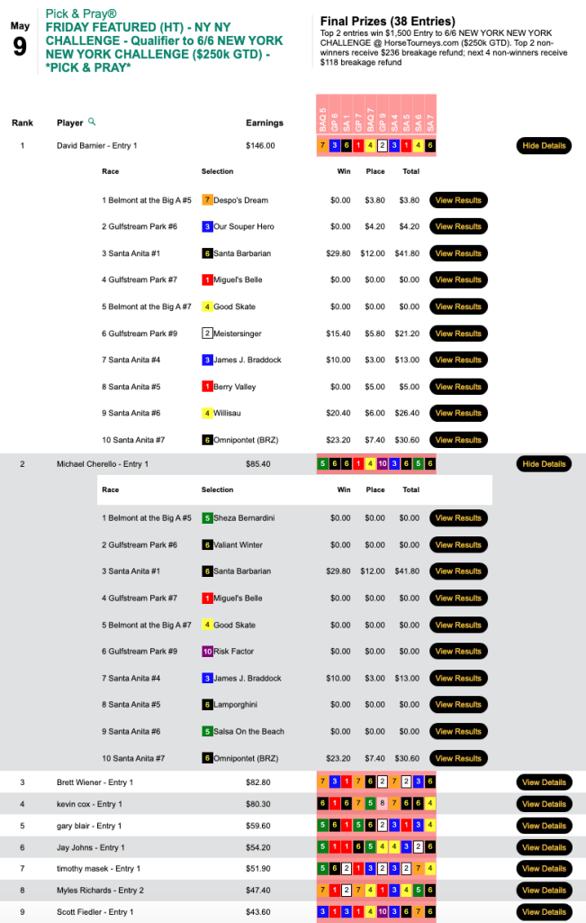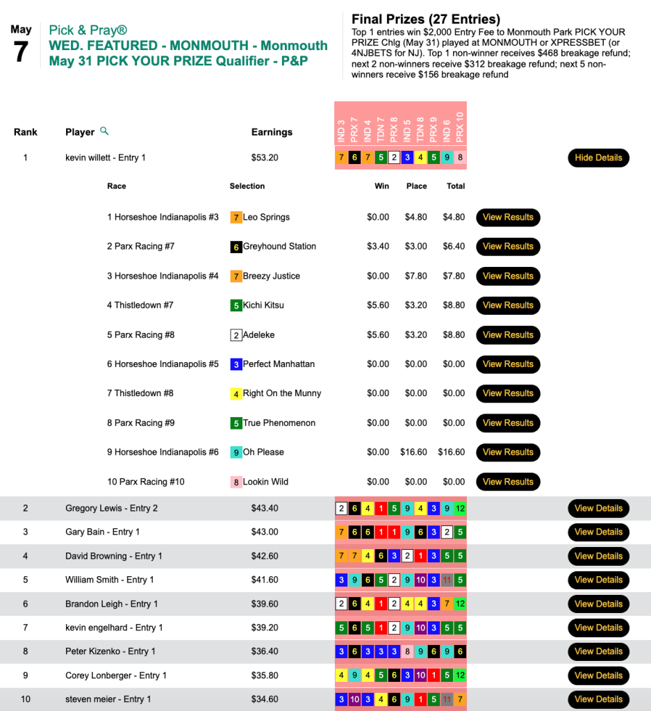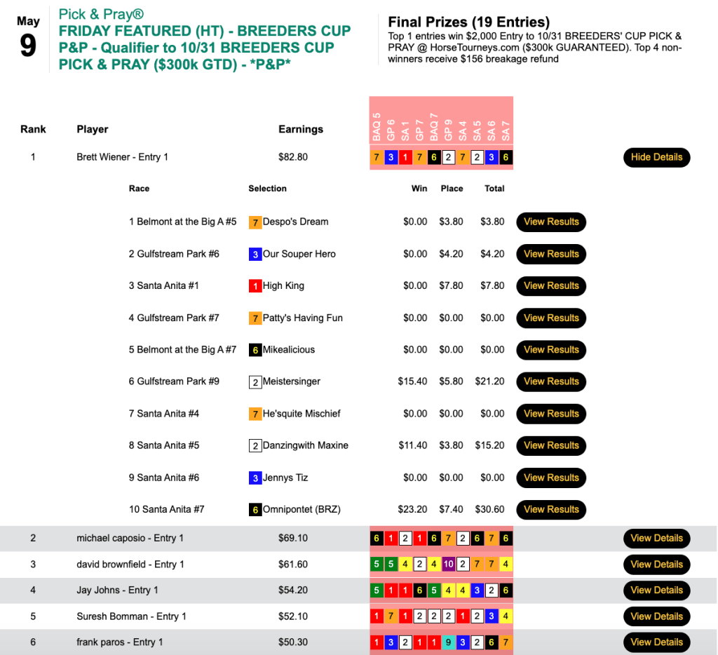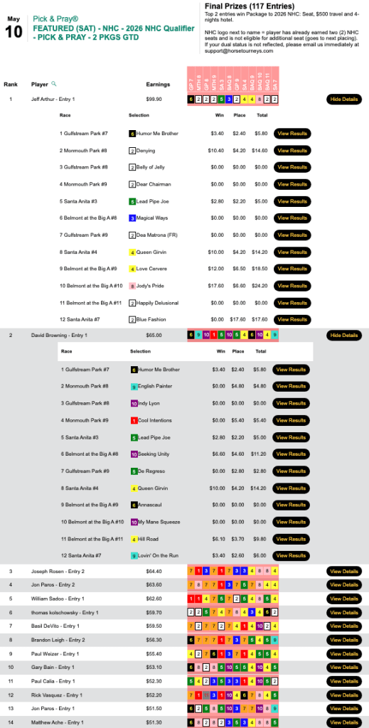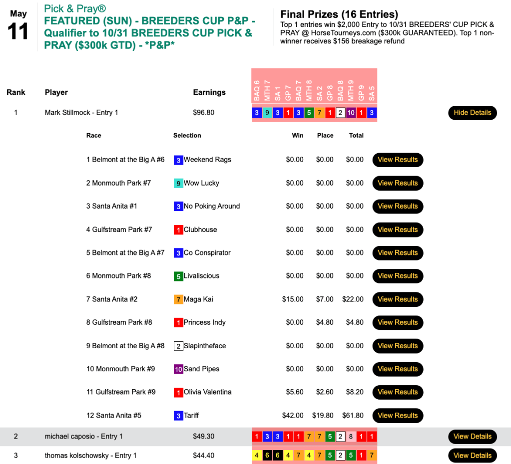 The $165 qualifier here at HorseTourneys was won by Jeff Arthur (6 wins, 1 place).