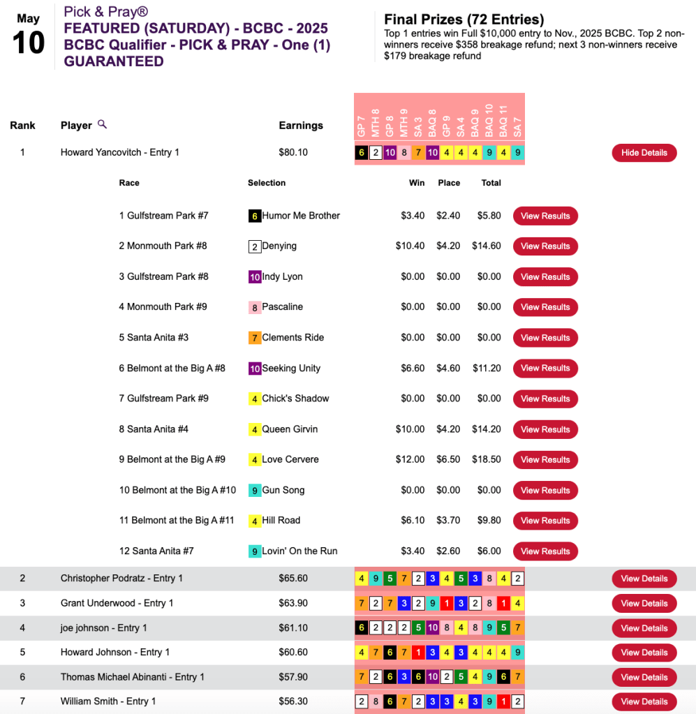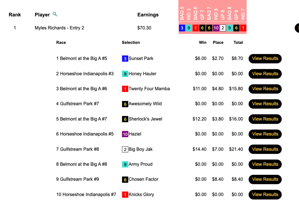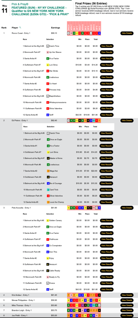 The winner, with 2 firsts (including Queen Girvin) and 5 seconds was 2019 Horse Player World Series champ Loyal Sprague. (He is, for all intents and purposes, the defending HPWS champ…since 2019 was the last time that event took place.)