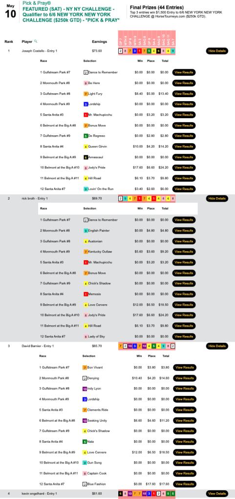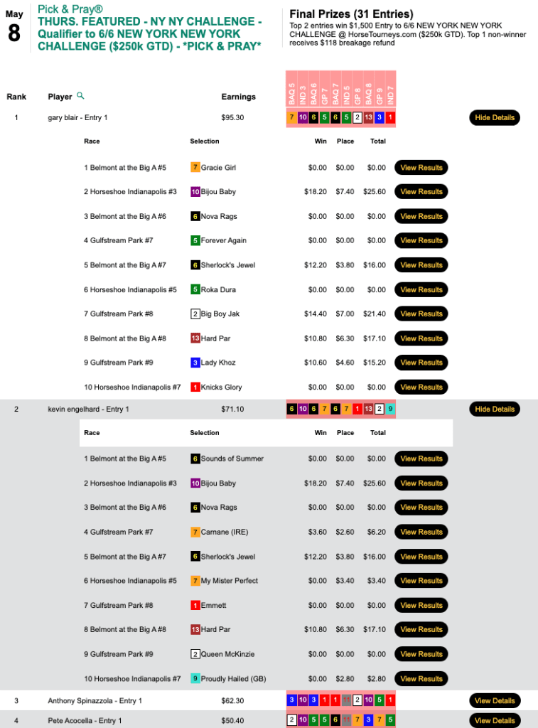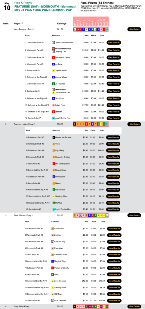 The two who wound up in front of Wiener in this one were Kerry Bassore (4 wins, 1 place) and Brandon Leigh (5W, 4P). Bassore scored with Jody’s Pride, while Leigh’s top winner paid $8.40. Bassore, Leigh and Wiener will reconvene on May 31…either at Monmouth or in cyberspace or some combination thereof.