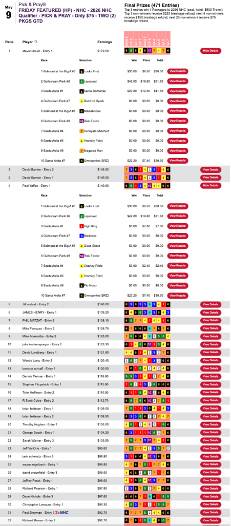 Predictably, it came in Friday’s always-well-attended $75 NHC qualifier at HorsePlayers. Meier (4 wins, 0 places) was in the zone at the outset, firing off three straight winners, including Layabout ($48.40, $19.60) in race 6 at Gulfstream. Barnier elected to play the same set of picks twice here, and he wound up in 2nd and 3rd. NTRA rules, however, permit no more than one seat win by a player in any given event. There were enough entrants on board this Friday for three Vegas packages to be awarded, so the third one went to Paul Yaffee, who got up for 4th by 90 cents at the end thanks to nailing Omnipotnet ($23.20, $7.40) in the final contest race, the 7th at Santa Anita.