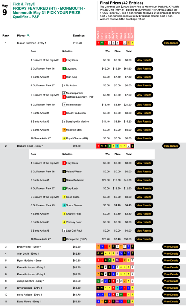 Bomman and Barbara Small (2W, 3P) emerged with the $2,000 entries in Friday’s qualifier to the Monmouth Pick Your Prize Challenge. Small’s best pick was 13-1 Santa Barbarian in the first at Santa Anita.