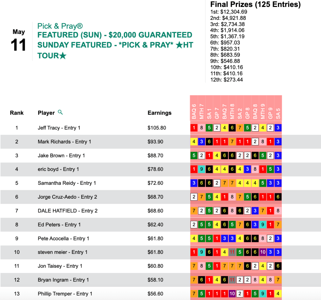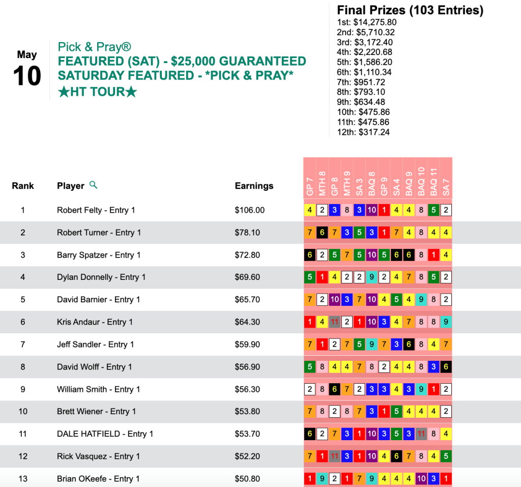 Felty (5 firsts, 2 seconds) accounted for the richest tourney of the week, our $25,000 Gtd. Pick & Pray (an HT Tour event), which was ultimately worth a total of $31,724. Felty collected $14,275 for the triumph.