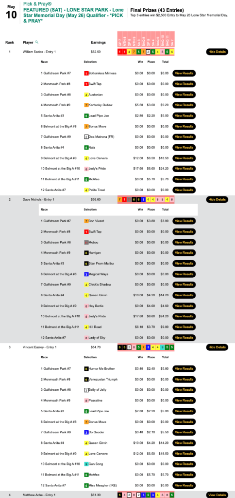 Congratulations to William “23” Sadoo (5 wins, 1 place), Dave “Gambling Actuary” Nichols (3W, 2P) and Vincent Easley (5W, 1P). Sadoo and Nichols played Jody’s Pride. Easley’s most lucrative selection was Love Cervere.
