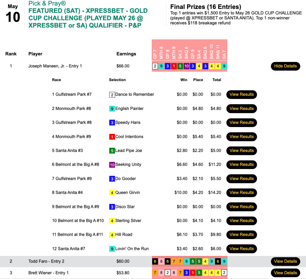Maneen racked up 6 wins and 3 places to take our first qualifier to the Xpressbet Santa Anita Gold Cup Challenge on May 26. His high-yielder was Queen Girvin ($10.00, $4.20) in race 4 at Santa Anita.