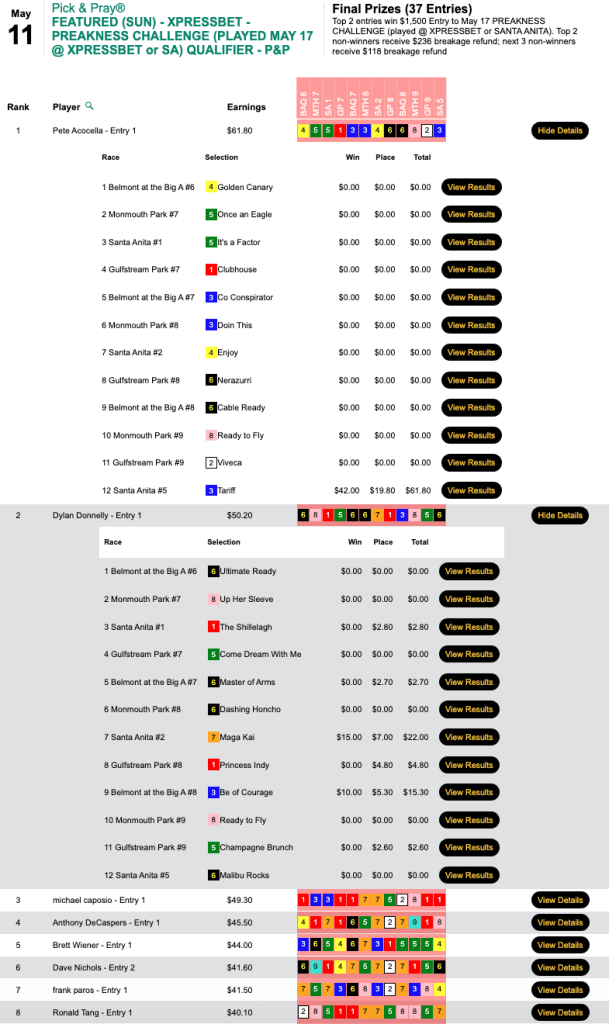 In fact, that’s the only thing Acocella got remotely right all day…but he still landed in first place in Sunday’s Preakness Challenge qualifier. Dylan Donnelly (4 wins, 2 places) didn’t back Tariff, but he did support Maga Kai ($15.00, $7.00) in Santa Anita race 2. Donnelly came away with the other available Preakness Challenge seat.