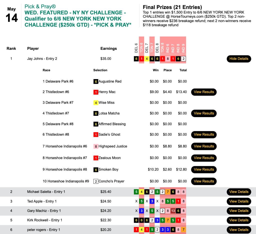 The 2022 NHC Tour champ—and former pancake honcho—had a rooty-tooty Wednesday by taking the day’s New York, New York Challenge qualifier. There were only seven contest races after Delaware Park announced that they were rained out, and there weren’t many prices to be had out there, but Johns found Henry Mac ($9.00, $4.40) in the 6th at Thistledown and managed to get the job done with 2 wins, 1 place and a score of $35.40.