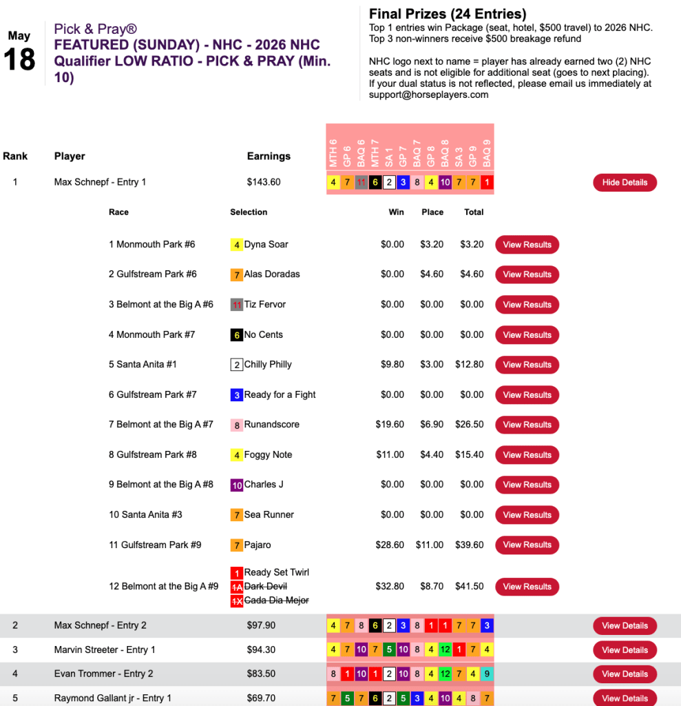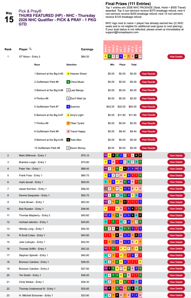 Claunch took the top spot in Saturday’s $210 NHC qualifier at HorsePlayers. He scored with the day’s biggest price, Unclecharliesgift ($36.20, $12.20) in the 10th at Gulfstream. Runner up Joe Johnson (4 wins, 5 places) also punched his ticket to Vegas. He did so by 40 cents over Kevin Engelhard, and, in the end, it came down to Johnson playing Journalism in the Preakness and Engelhard going with Clever Again.