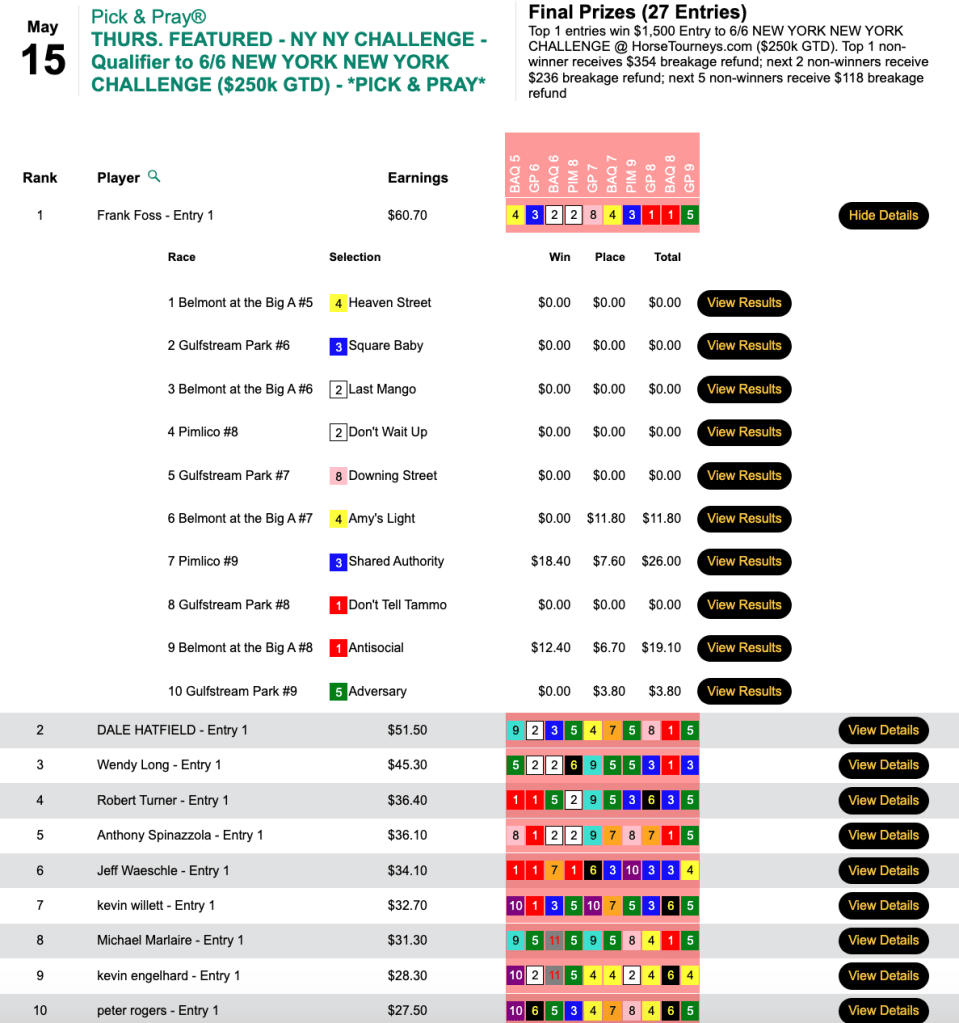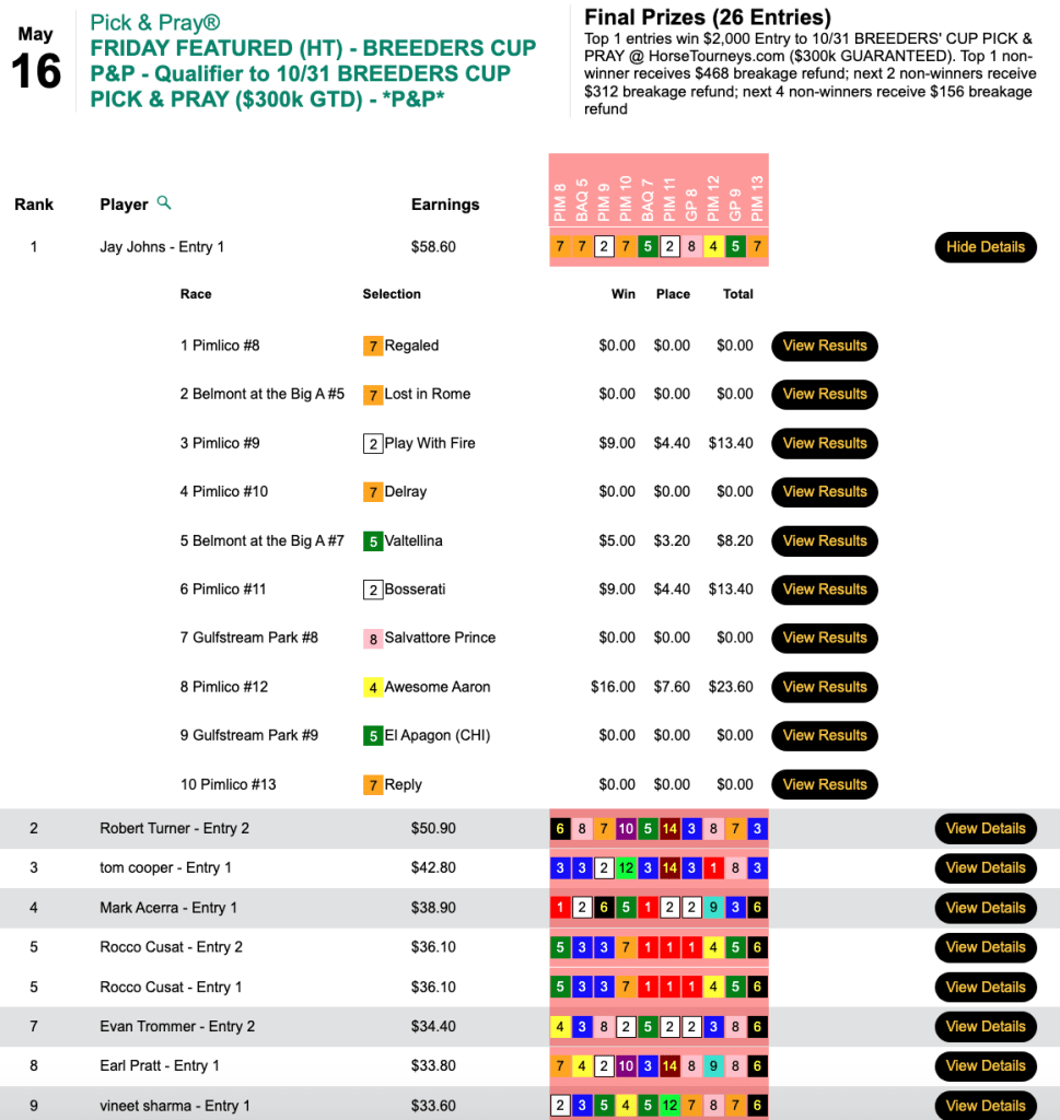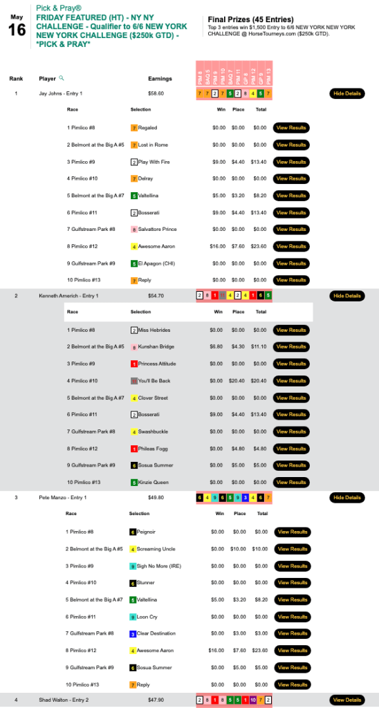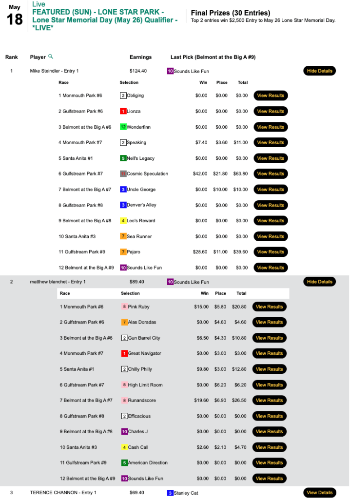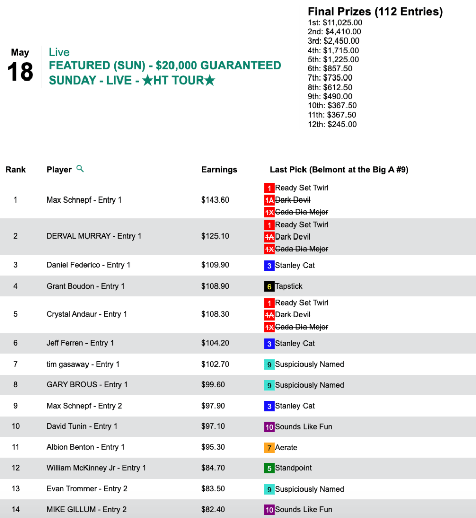 Thanks to everyone who spent a part of their Preakness week with us. The weekend ahead, of course, is Memorial Day weekend. So we’ll have an extra set of featured tourneys for you on Monday, the 26th. That means the next batch of recaps will come your way on Tuesday, the 27th. Until then…good luck!