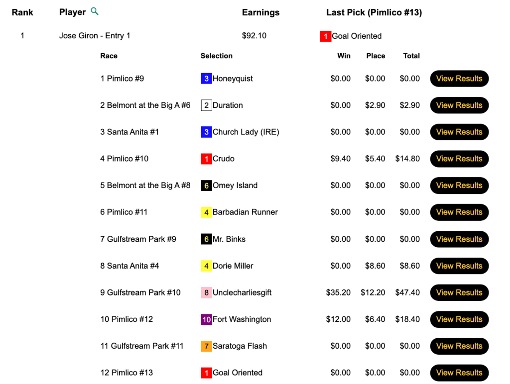 Kenneth Arnerich (2 wins, 3 places) and Pete Manzo (2W, 3P) also reeled in $1,500 entries to the $250,000 Guaranteed, two-day event in about three weeks. Manzo had Awesome Aaron, while Arnerich’s best return came on a $20.40 place collection supplied by You’ll Be Back, runner up in race 10 at Pimlico.
