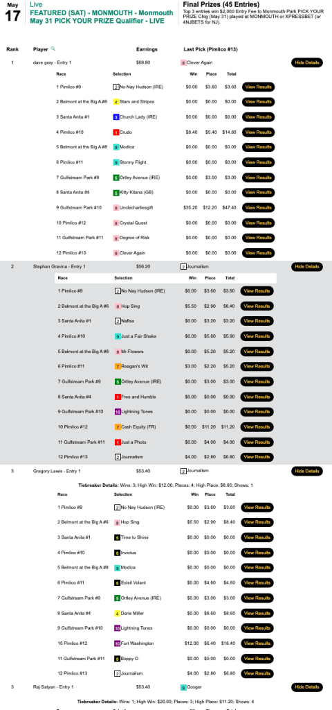 They were the four to secure $2,000 entries in Friday’s Monmouth Pick Your Prize Challenge qualifier. Bussan got his seat via tiebreaker over Stephen Luca by virtue of having four winners to Luca’s three.