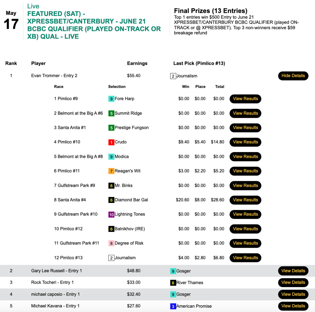 Trommer claimed the $500 seat in Saturday’s play-in to the Xpressbet Canterbury BCBC Qualifier on June 25.