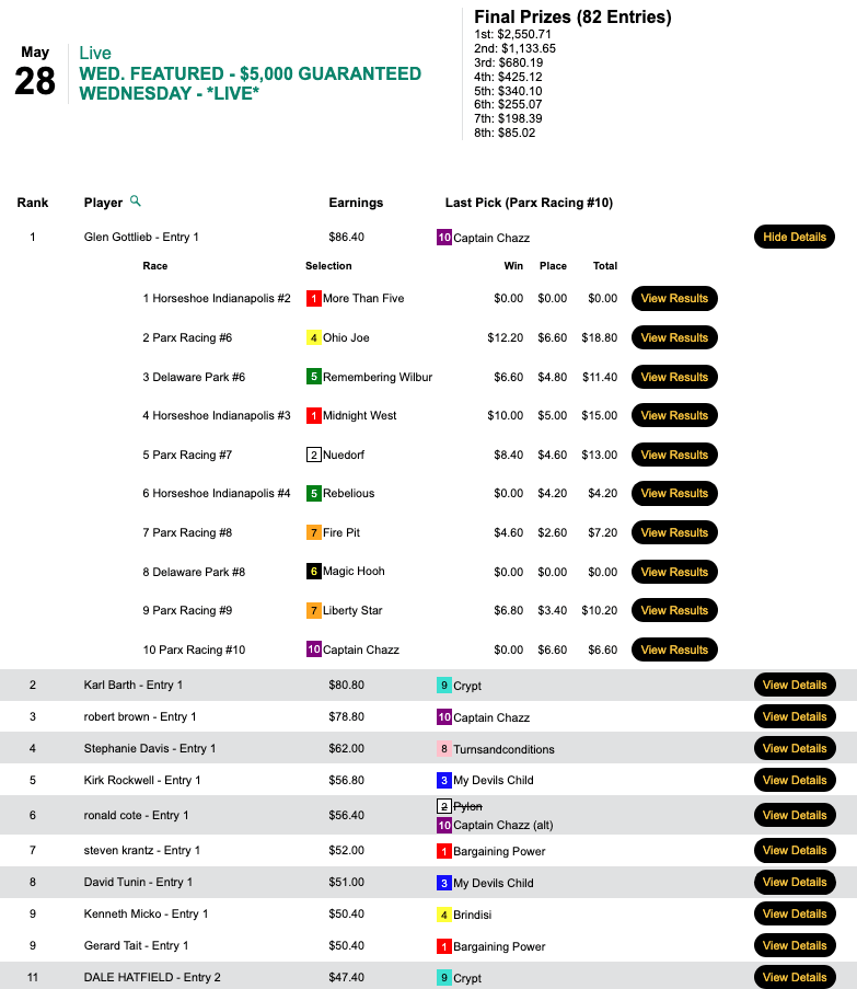 Glen Gottlieb (6 firsts, 2 seconds) accounted for the other Wednesday feature, our $5,000 Guaranteed cash game.