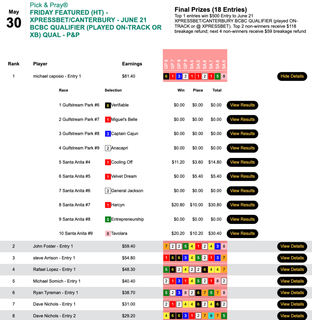 Michael Somich (2 firsts, 1 second) took home the $2,000 entry in Friday’s qualifier to the new Breeders’ Cup Pick & Pray tourney.