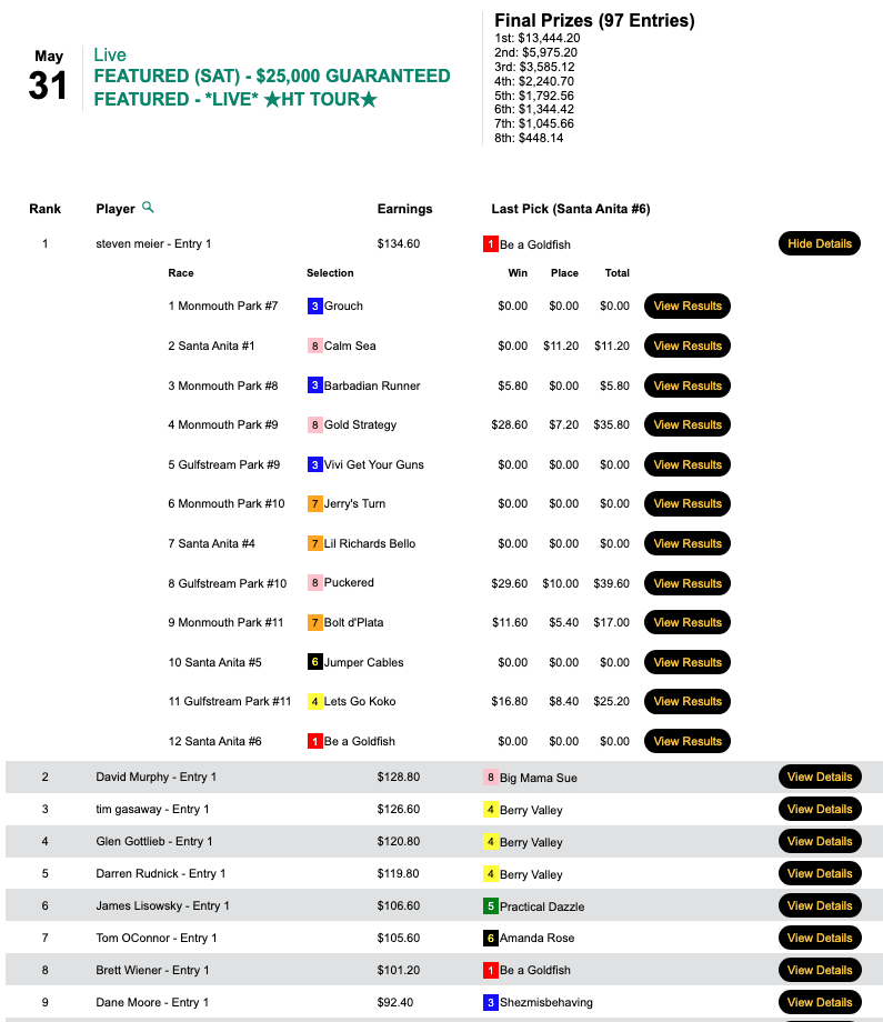 he most rewarding of the three came in Saturday’s HT Tour competition, our $25,000 Guaranteed cash tourney, which closed with a final pot of $29,876. Meier came up with 5 winners—including Puckered ($29.60, $10.00) in the 10th at Gulfstream—and 1 runner up to collect the first prize of $13,444.