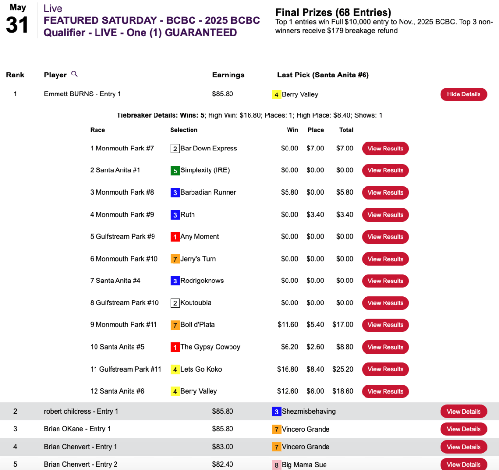 The final Saturday tourney to recap is the $179 Breeders’ Cup Betting Challenge qualifier at HorsePlayers. It was one to remember for Emmett Burns. And one to forget for both Robert Childress and Brian O’Kane.