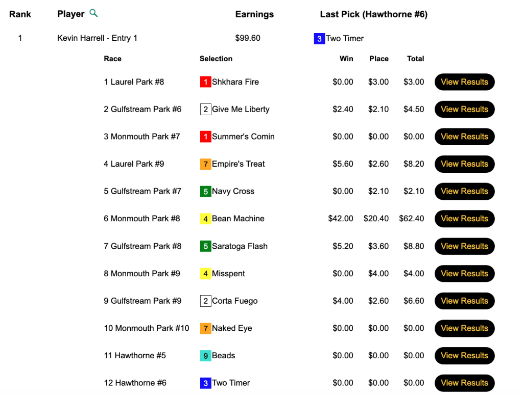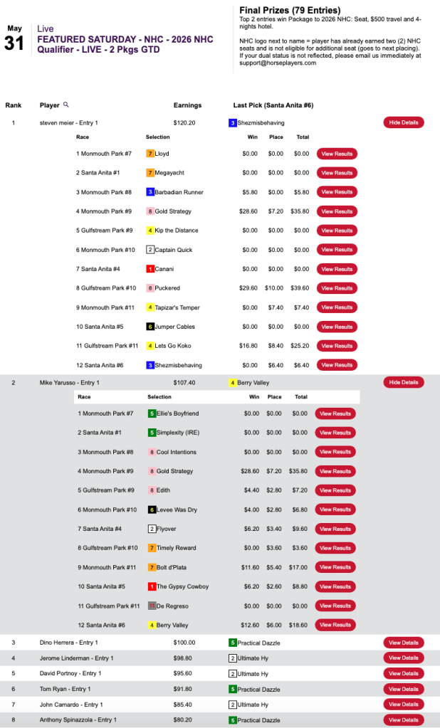 Frank got an NHC berth in Sunday’s $165 Pick & Pray at HorsePlayers. So did runner up—and fellow Bean Machine backer—Brian Flynn (5 wins, 3 places).