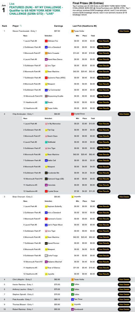They were the five winners of $1,500 seats in Sunday’s multi-track play-in to the New York, New York Challenge. In another tight battle/tough beat, Ramirez got the nod for 5th via tiebreaker over Anthony Laurino who had the same winner and same runner up as Ramirez. Show runners turned out to be the deciding factor and Ramirez had three of those compared to one for Laurino.