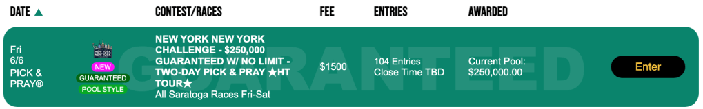 We’ll have another wide array of featured tourneys starting this Wednesday. Though the main spotlight will be on the inaugural New York, New York Challenge here on Friday and Saturday. Contestants will be making full-card, Pick & Pray selections on the Friday and Saturday cards of the Belmont Stakes Festival taking place at Saratoga. Qualifiers will continue through Thursday, and $1,500 buy-ins to the $250,000 Guaranteed tourney will remain open right up until first post on Friday. Note, however, that Friday’s first post is an early one—11:40 am ET. So, especially if you live on the West Coast, do not oversleep on Friday (or Saturday when first post is 10:45 am ET).