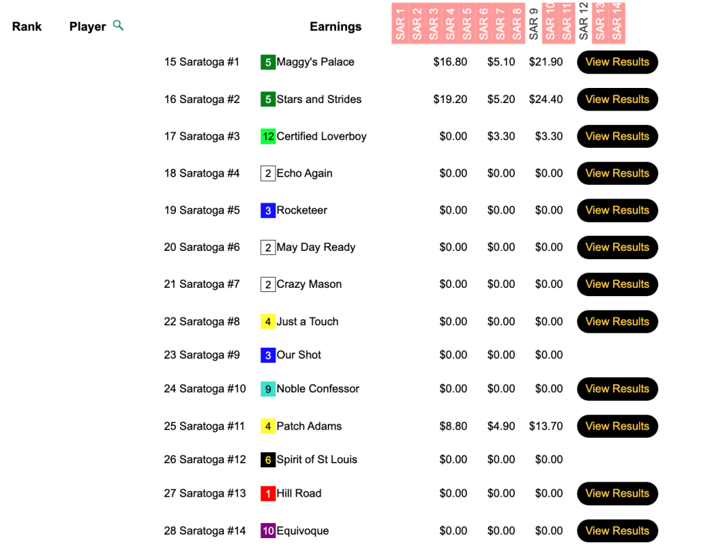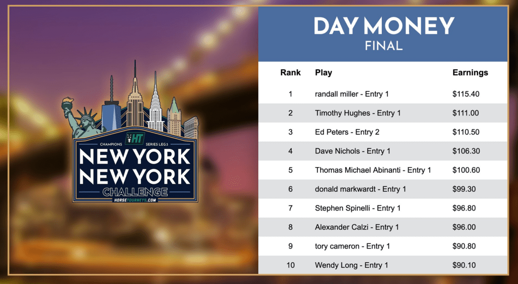 The four Saturday Day Money winners list reads like a Who’s Who of HorseTourneys players this decade. Randy Miller won the 2021 Spa & Surf Showdown. Tim Hughes took the 2022 edition of the Spa & Surf. Ed Peters was the 2023 HT Tour champion and Dave “Gambling Actuary” Nichols currently heads the the 2025 HT Tour standings.
