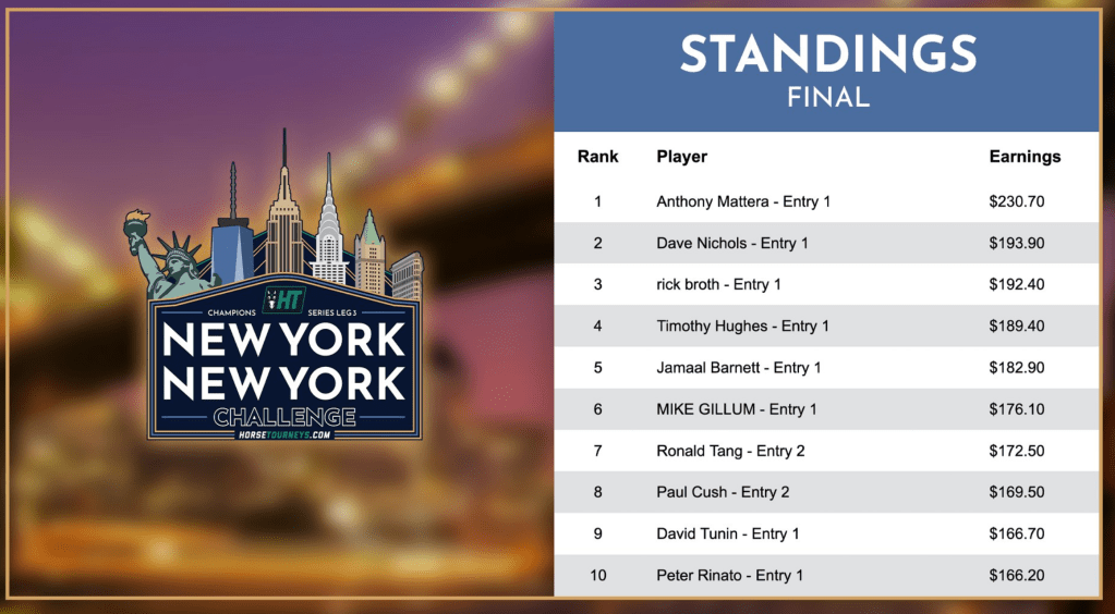 Then in the 2021 Spa & Surf Showdown, Mattera led at the conclusion of Day 1 by more than a cap horse ($72.00 to be exact). He wound up finishing fifth and settling for $45,000 instead of the first-place prize of $235,000. (The three top-10 finishes comfortably earned Mattera top honors in that year’s HT Tourney Triple Series.)