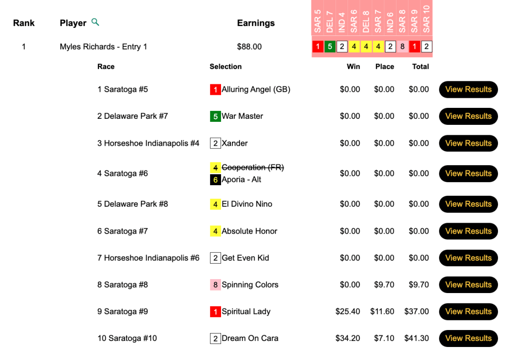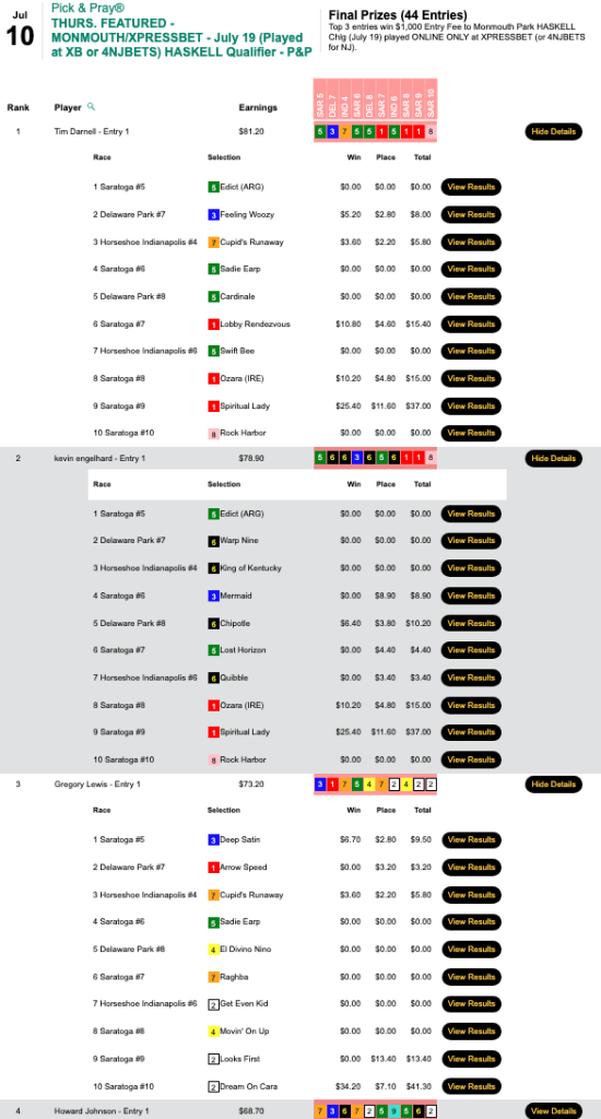 Engelhard (3 wins, 3 places) was one of three players to earn $1,000 entries for this Saturday’s Haskell Day test. He finished behind Tim Darnell (5W, 0P) and ahead of the other $70+ scorer, Gregory Lewis (3W, 2P). The top two hit Spiritual Lady ($25.40, $11.60) in the 9th at Saratoga, while the top return for Lewis came one race later at the Spa with Dream on Cara ($34.20, $7.10).