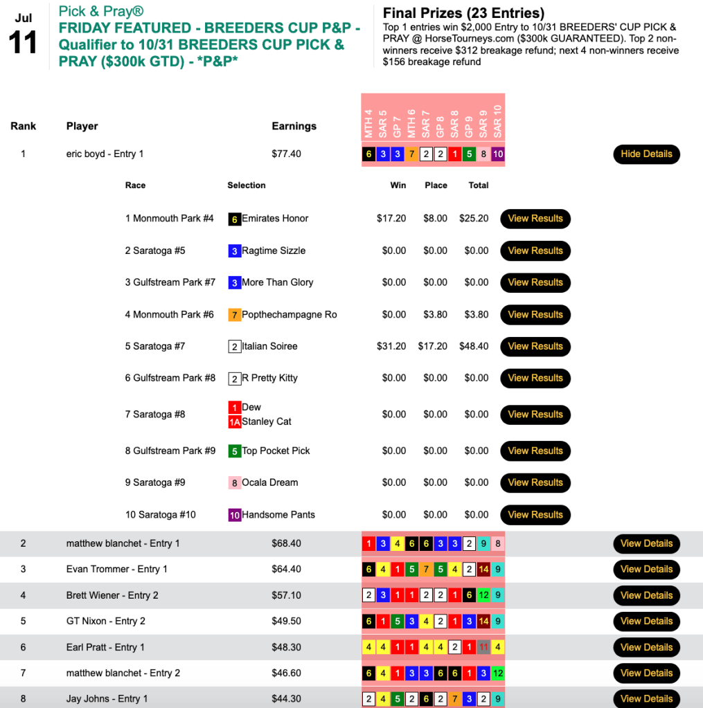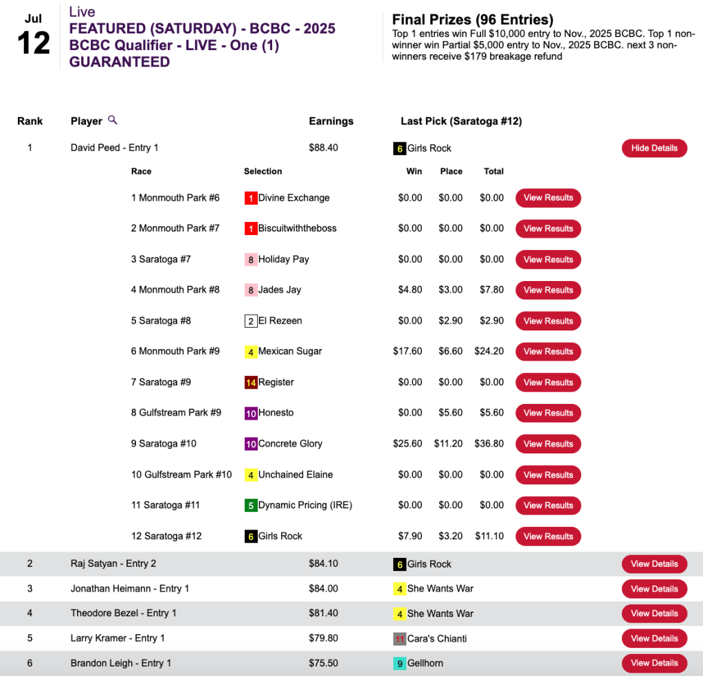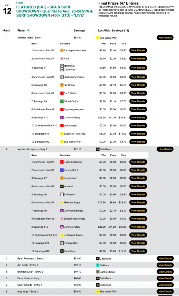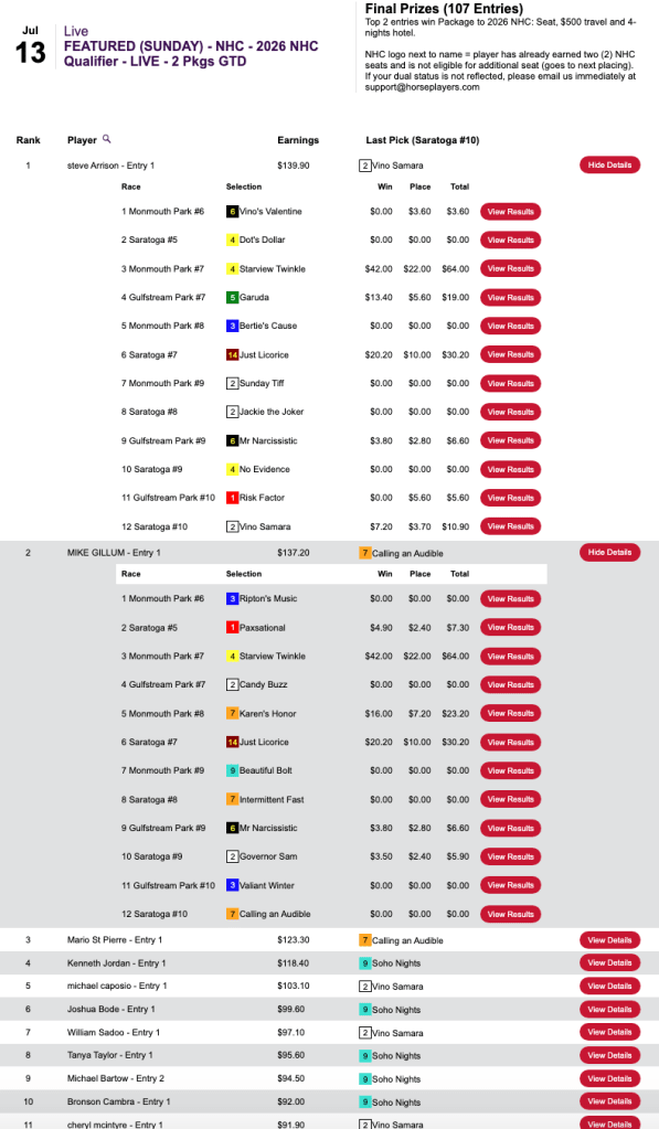 Viens stockpiled 7 firsts and 1 second to lead the way in Saturday’s $165 NHC Pick & Pray. The other seat went to Mike Rajoppi, who made even more collections (7 wins and 2 places) and prevailed by just 20 cents over an unlucky Raj Satyan. Viens and Rajoppi both saw their NHC aspirations solidify significantly with Concrete Glory.