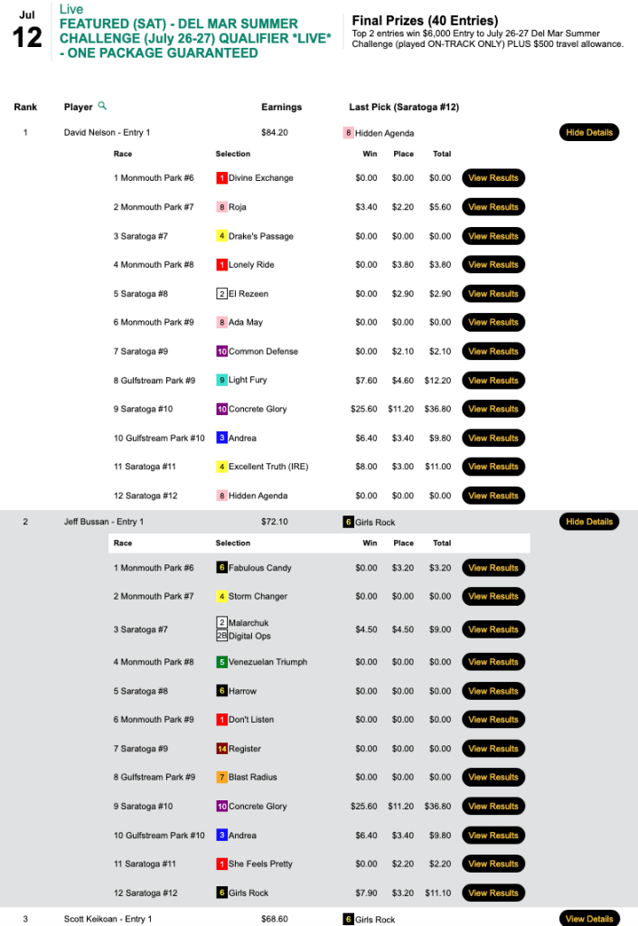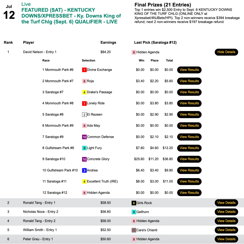 David Nelson made three really good decisions on Saturday. He hit the day’s biggest price—Concrete Glory ($25.60, $11.20) in the 10th at Saratoga; he played multiple featured tourneys; and perhaps most importantly, he used the same picks on all of his entries…even though most of the marquee games were conducted in Live format.