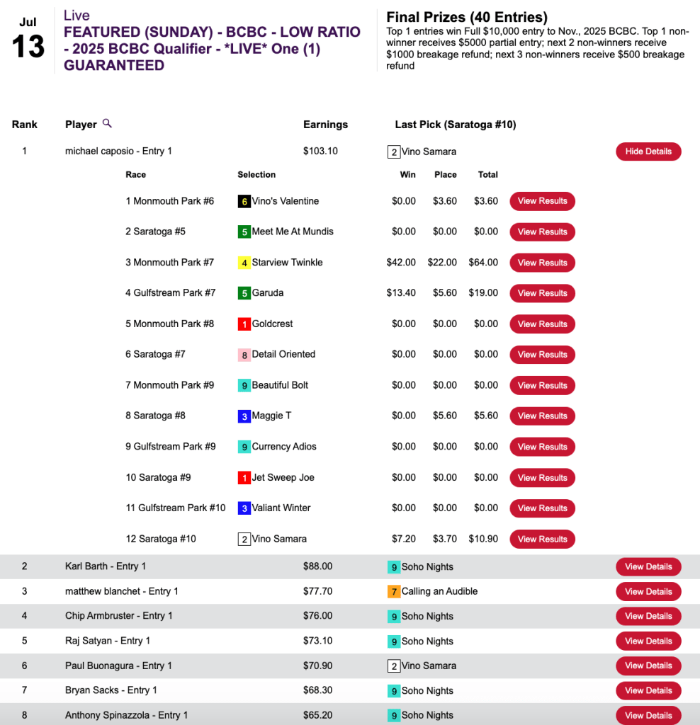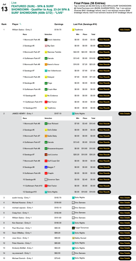 That’s because he had cap horse Starview Twinkle here…which led him to another first-place finish. Also snatching up a $2,500 entry in this qualifier was runner up James Henry, winner of the 2013 Horse Players World Series. Henry (4 wins, 4 places) was one of the few successful Sunday participants who didn’t have Starview Twinkle. His best hit was Just Licorice ($20.20, $10.00) in the 7th at Saratoga.