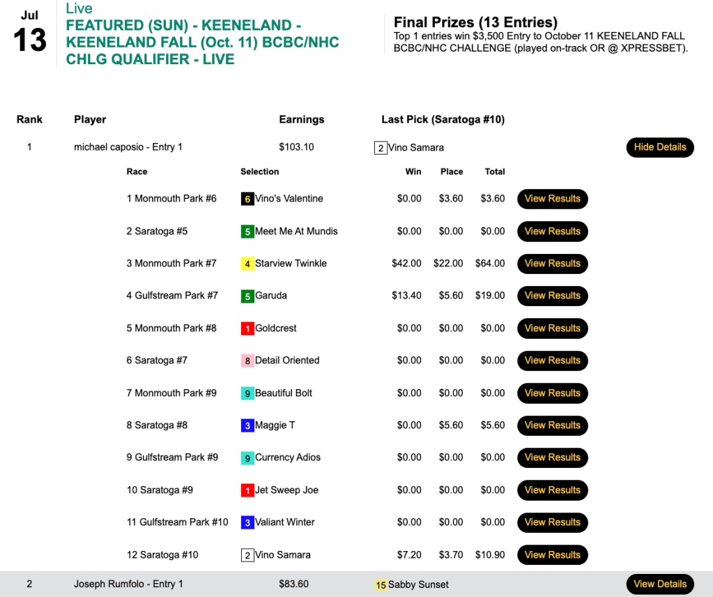The other four ticket punchers were George “Ki-“ Bosch (3 wins, 1 place), Sean O’Malley (2W, 1P), Paul “Morning” Kloeker (5W, 0P) and Mike Lazarus (3W, 1P). They all hit Starview Twinkle. We commented earlier that, on Friday, Ken Jordan played the same entry twice and won two Haskell Challenge seats in one qualifier. Here, Lazarus played his entry twice and pulled off an even more unlikely feat—at least based on the percentage probabilities. He won one seat and one $79 breakage refund.