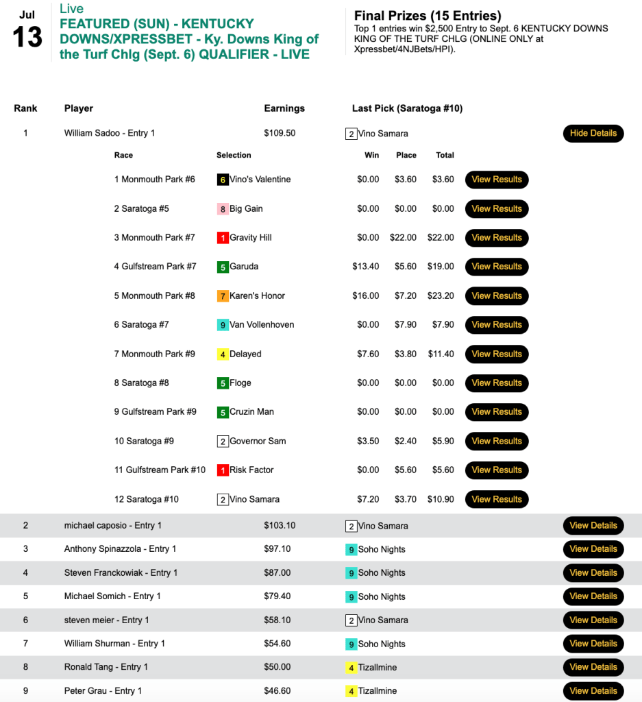 In Sunday’s Spa & Surf Showdown qualifier, Sadoo had one fewer win and one fewer place on his scorecard, relative to the ones in his NHC and Kentucky Downs play-in victories. However, Sadoo scored higher in this one.