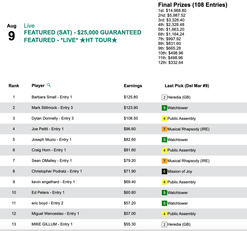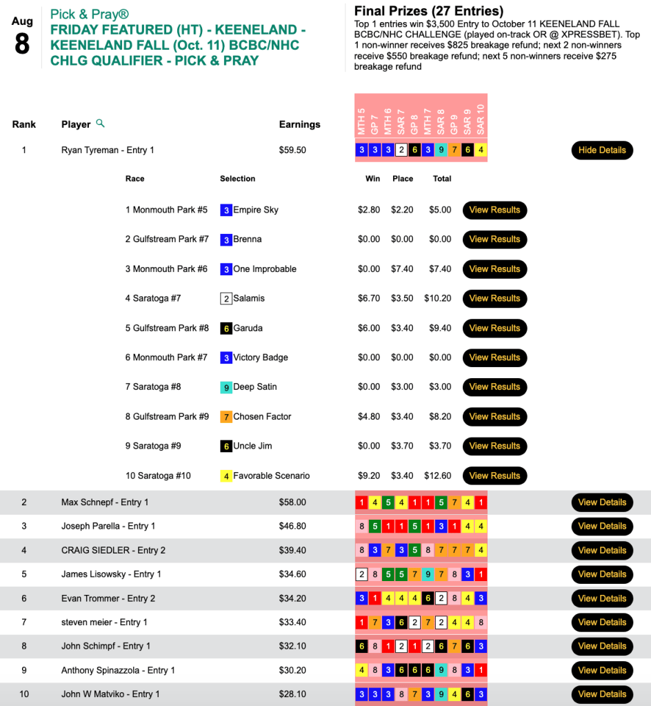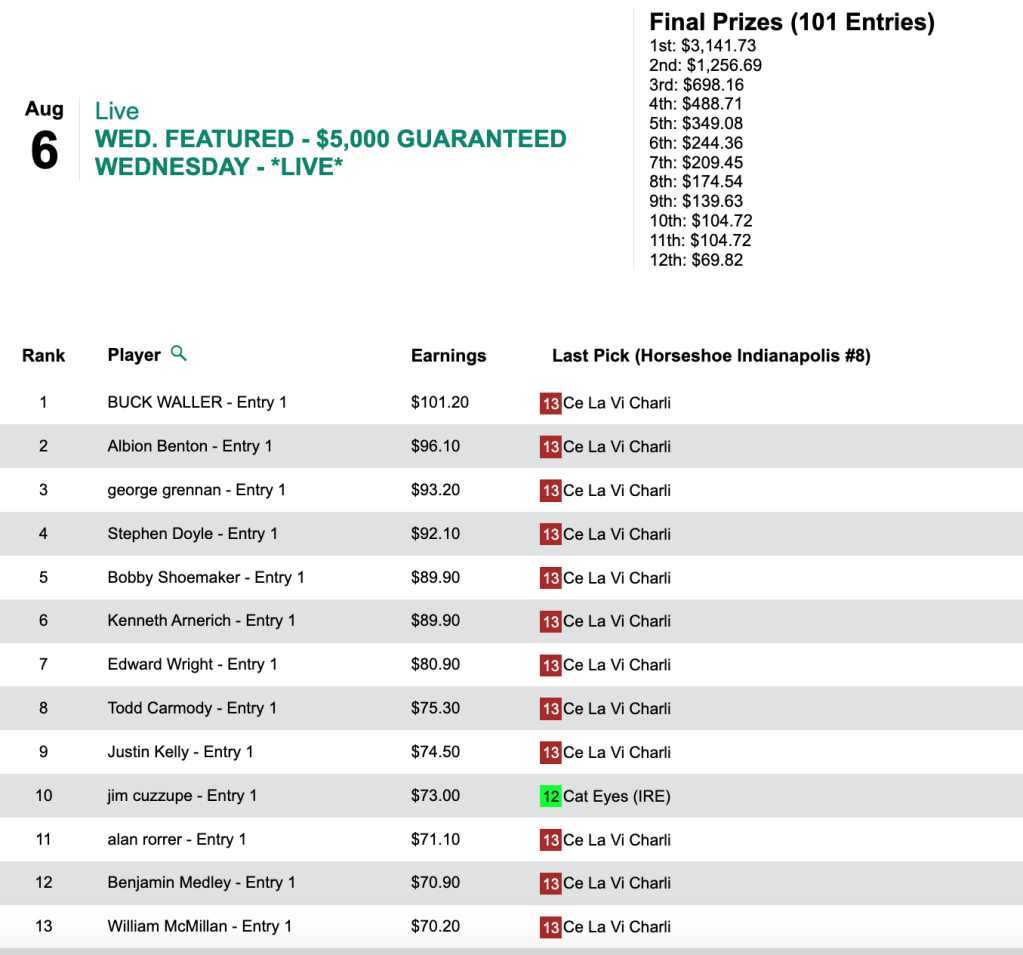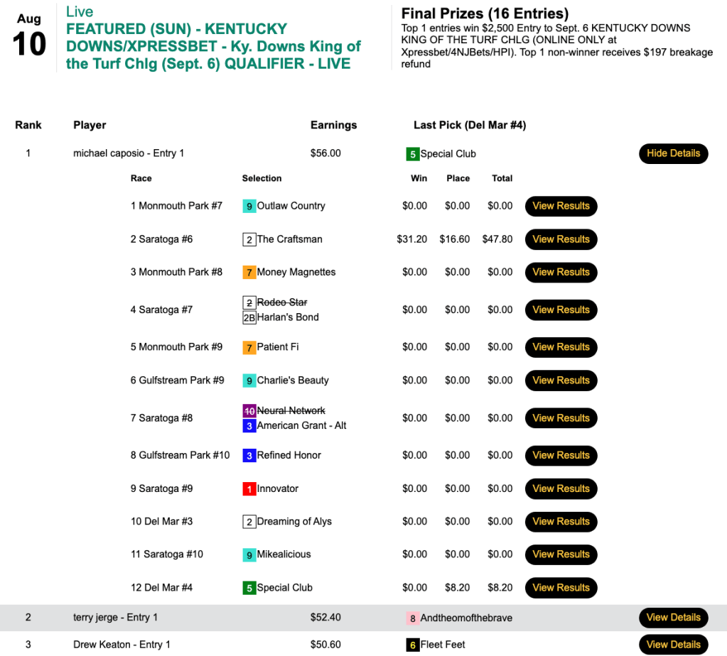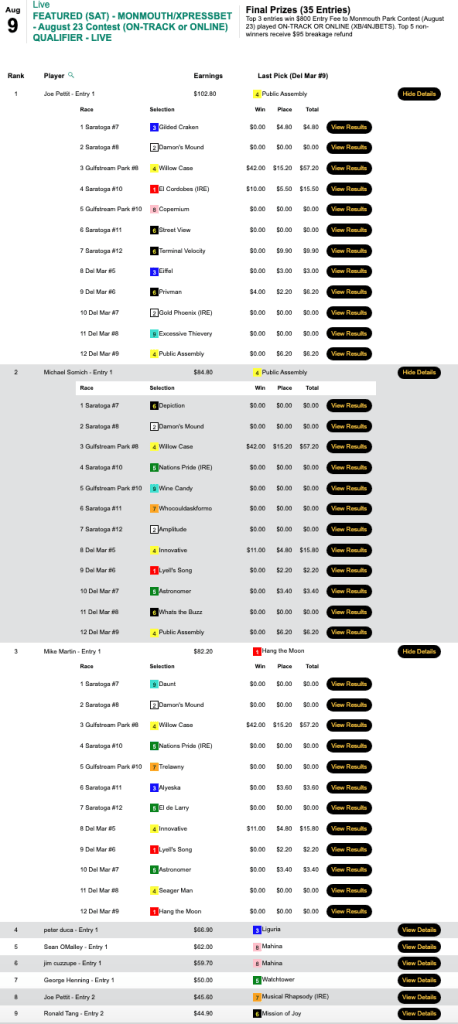 The three players to exceed the $50.00 mark were the three to pick up $800 entries in Friday’s qualifier to the August 23 Monmouth/Saratoga Contest at Monmouth/Xpressbet.