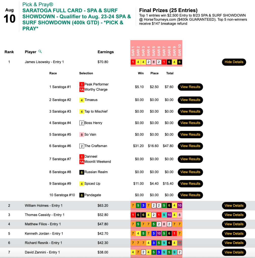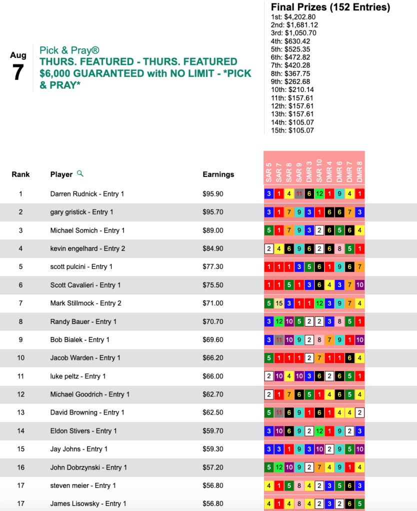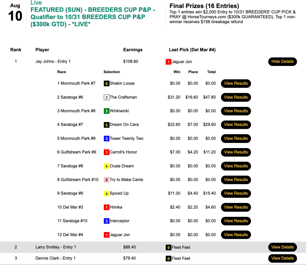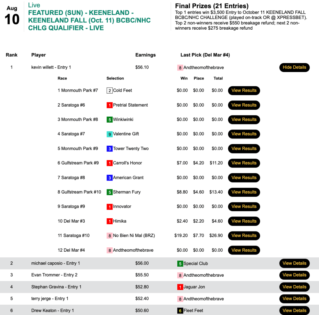 The three players to exceed the $50.00 mark were the three to pick up $800 entries in Friday’s qualifier to the August 23 Monmouth/Saratoga Contest at Monmouth/Xpressbet.