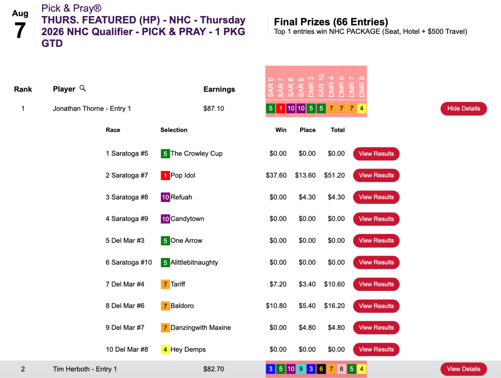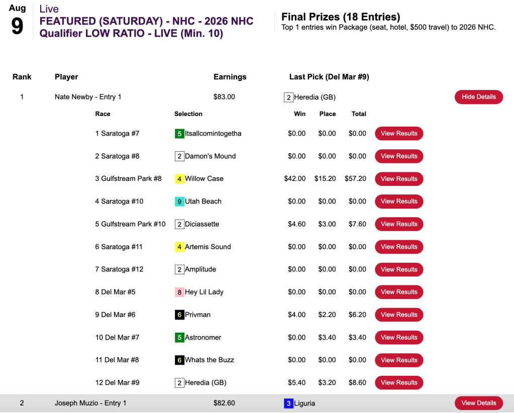 There was also a $500 Low Ratio NHC qualifier at HorsePlayers on Saturday.
