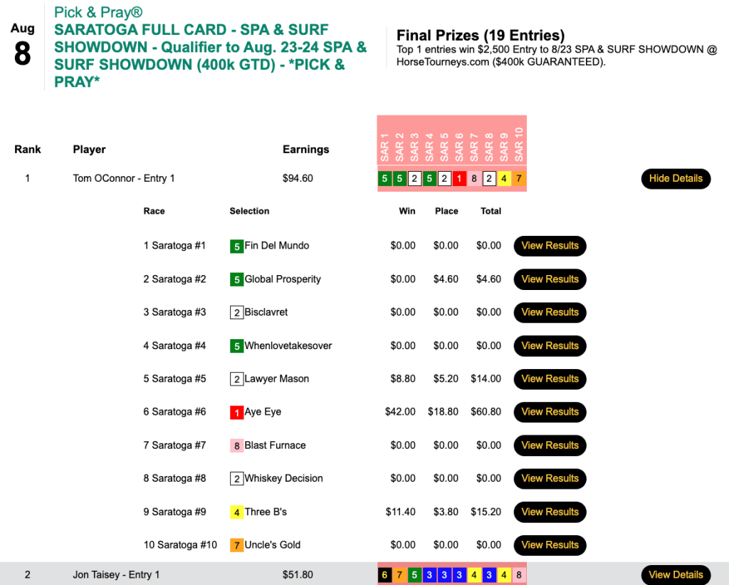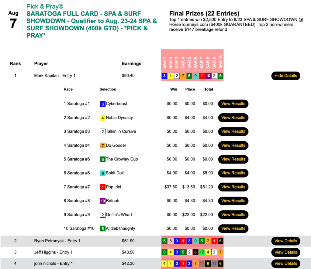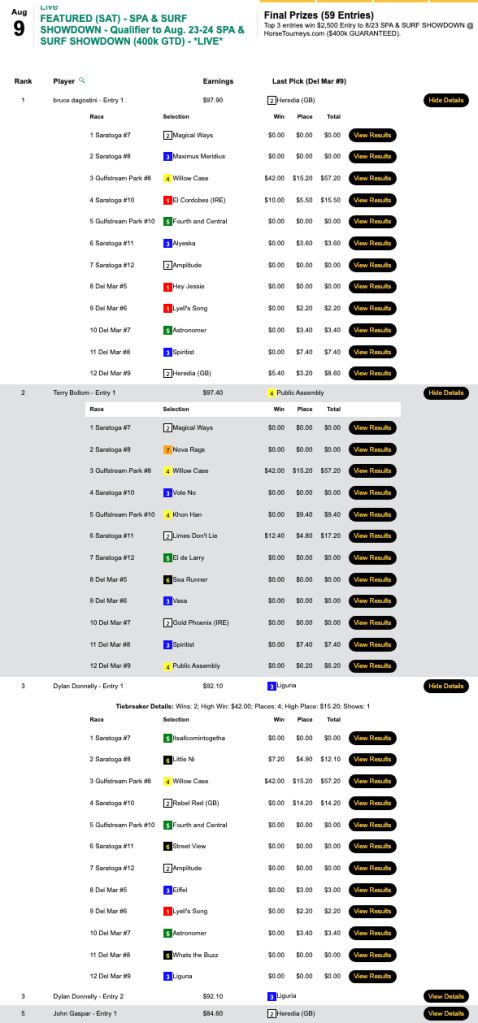 There was also a Spa & Surf Showdown qualifier on Wednesday that was contested on just the full card from Saratoga. In this game, too, a big price (42-1) won the final race.