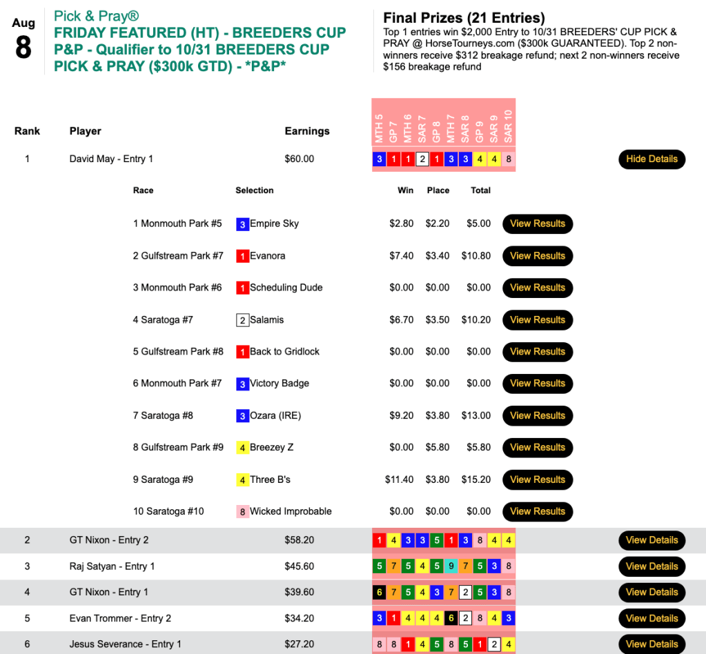 May (5 firsts, 1 second) snagged the $2,000 berth in Friday’s qualifier to the inaugural Breeders’ Cup Pick & Pray tourney, a $300,000 Guaranteed competition here on October 31-November 1.
