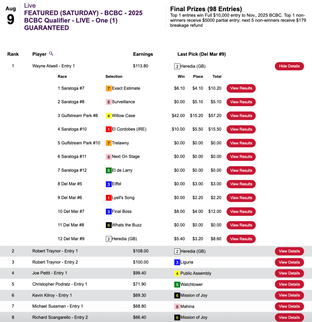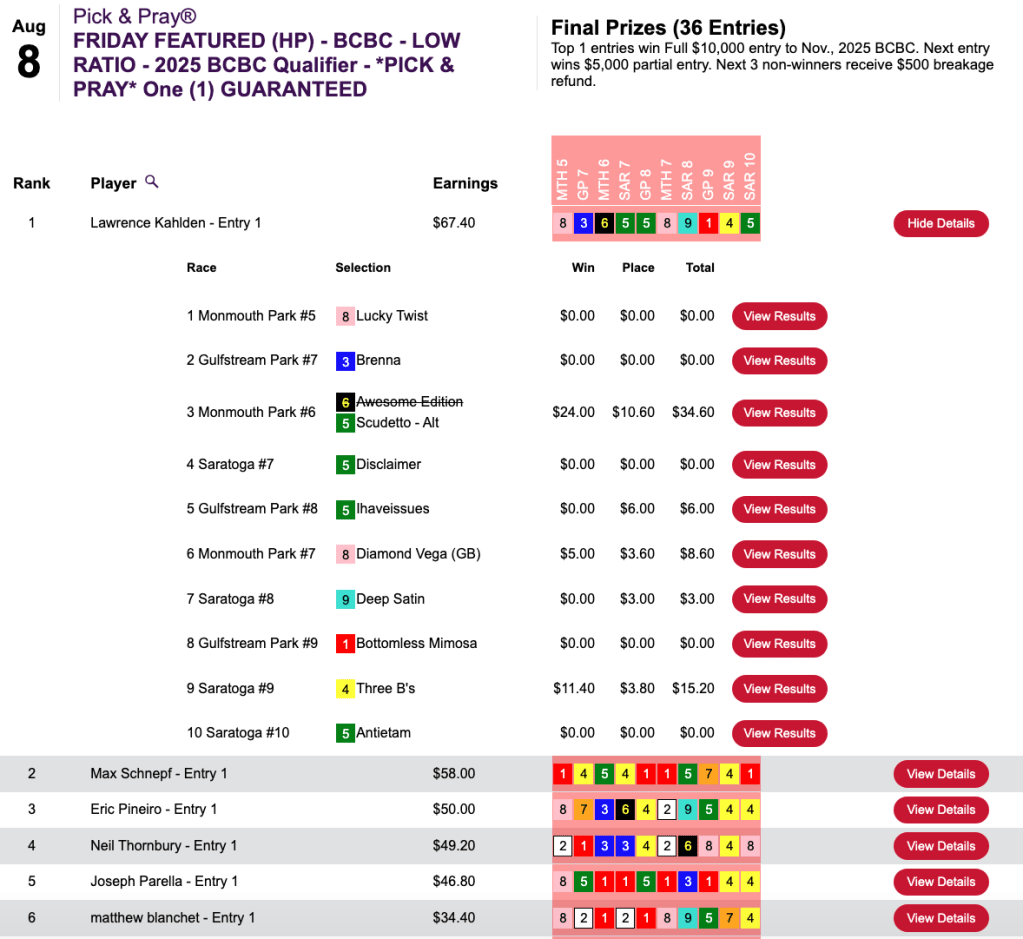 Kahlden received a coveted Breeders’ Cup Betting Challenge seat by capturing Friday’s Low Ratio qualifier at HorsePlayers. Max Schnepf earned a $5,000 partial BCBC entry for reporting home in second place.