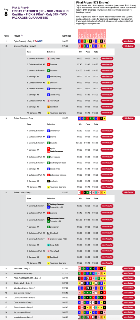 The already-double-qualified Californian was playing for points in Friday’s $75 NHC qualifier at HorsePlayers, and maximum points is what he got. The seats, meanwhile, went to 2nd-, 3rd- and 4th-place finishers Bronson Cambra (also in the top 10 of the NHC Tour standings), Rob Ramirez and Robert Little. The Friday “Fab Four” all connected with Scudetto ($24.00, $10.60) in race 6 at Monmouth.