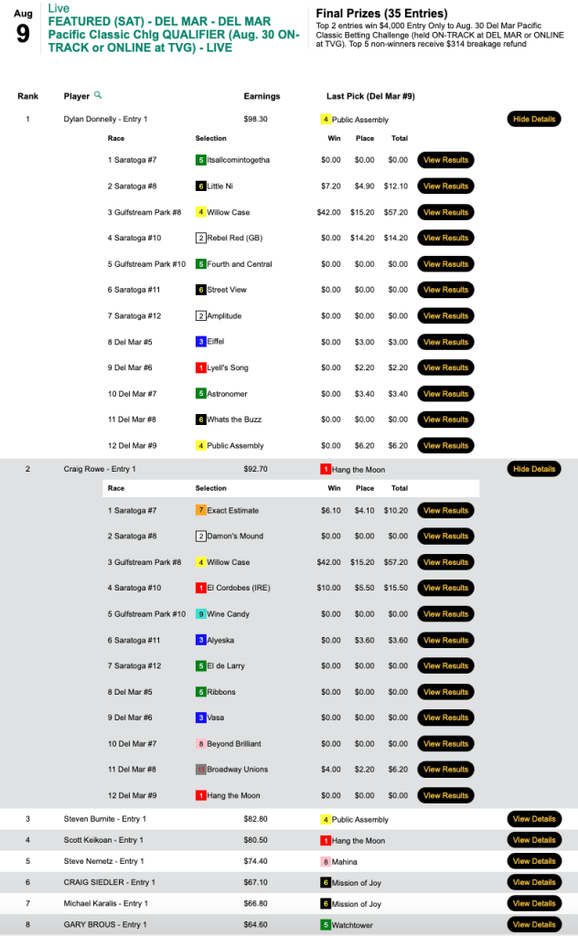 Donnelly (2 wins, 5 places) grabbed a hefty, $4,000 seat for leading the way in Saturday’s Del Mar Pacific Classic Challenge qualifier. He will be joined at the August 30 contest by runner up Craig Rowe (4W, 1P), who was the other player to score in the 90s. They both hit the horse that was most central to Saturday success—Willow Case ($56.00, $15.20) in the 8th at Gulfstream.