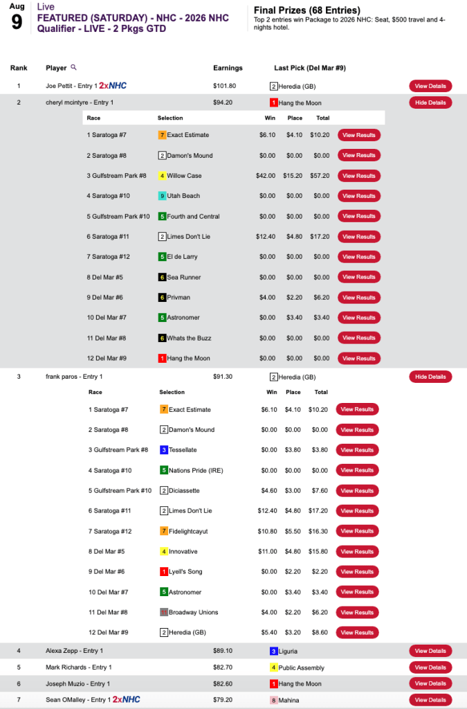 Paros put up 7 winners and 3 runners up from 12 races to bag an NHC seat in Saturday’s $210 qualifier at HorsePlayers. His frequent collections—led by Limes Don’t Lie ($12.40, $4.80) in the 11th at Saratoga—got him ahead of everybody except Joe Pettit and 2016 NHC Tour champion Cheryl McIntyre (4 wins, 1 place). Pettit was already double-qualified, however, so that left the two available Vegas packages to McIntyre (who hit 27-1 Willow Case) and Paros.